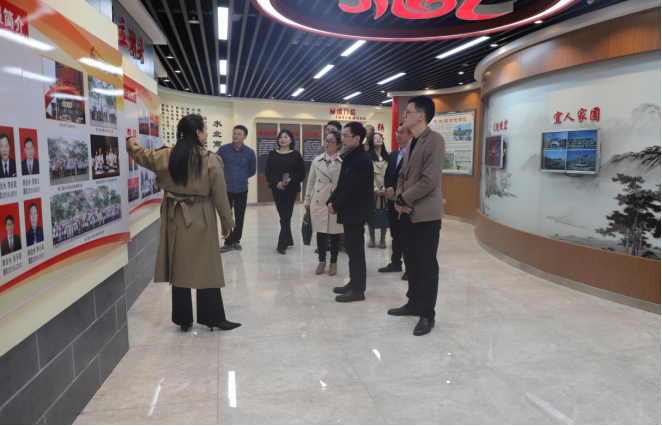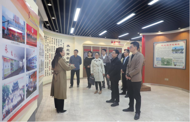 在商会办公室工作人员甘芳芳的引领下,副校长刘德华一行参观了商会展示馆详细了解了商会党委和商会的发展历程、组织架构以及商会“举党旗抱团干带民富”的“党建+乡镇商会”模式特征。通过甘芳芳的讲解,副校长刘德华一行了解了多年来水北商会在“万企兴万村”行动中的具体做法和取得的成效,以及商会积极开展“党建+乡村振兴、党建+ 颐养之家、党建+捐资助学、党建+扶弱济困”等各项工作,大家对商会的创新思路所取得的成效赞不绝口。