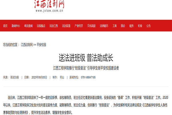 由于学校针对在校学生的安全教育管理工作,做到了领导重视、职责制度健全、组织机构完善、突出抓好“三个关键”环节重点举措,以点带面,实现了2018年以来,我校校园未发生有影响的政治事件、重特大刑事、治安案件和各类重大安全事故的工作目标。2019年、2020年,我校安全稳定工作经过省教育厅年度考核评估,连续两年获得“江西省平安校园”荣誉称号。