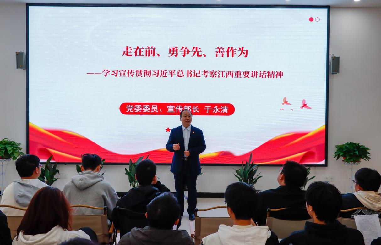 党委委员、宣传部部长于永清以“走在前、勇争先、善作为—学习宣传贯彻习近平总书记考察江西重要讲话精神”为主题展开宣讲。他围绕习近平总书记再次考察江西的重大意义、习近平总书记对江西发展提出的新的战略定位、习近平总书记对江西发展提出的任务要求、如何把握习近平总书记对进一步推动长江经济带高质量发展的重要要求和深刻把握贯彻落实习近平总书记考察江西重要讲话精神的实践要求五个方面,引导广大团员青年要深入系统学习、更加精准领会把握,切实把思想和行动与习近平总书记重要讲话精神相统一,准确把握新时代高等教育高质量发展要求和学校的办学定位与发展方向,形成个人职业发展与学校事业发展的同向同行、同频共振。要坚定不移听党话、跟党走,怀抱梦想又脚踏实地,敢想敢为又善作善成,立志做有理想、敢担当、能吃苦、肯奋斗的新时代好青年,在服务江西“三大高地”“五大战略”“1269”行动计划以及我市“6313”行动计划实现更大贡献、更有作为。