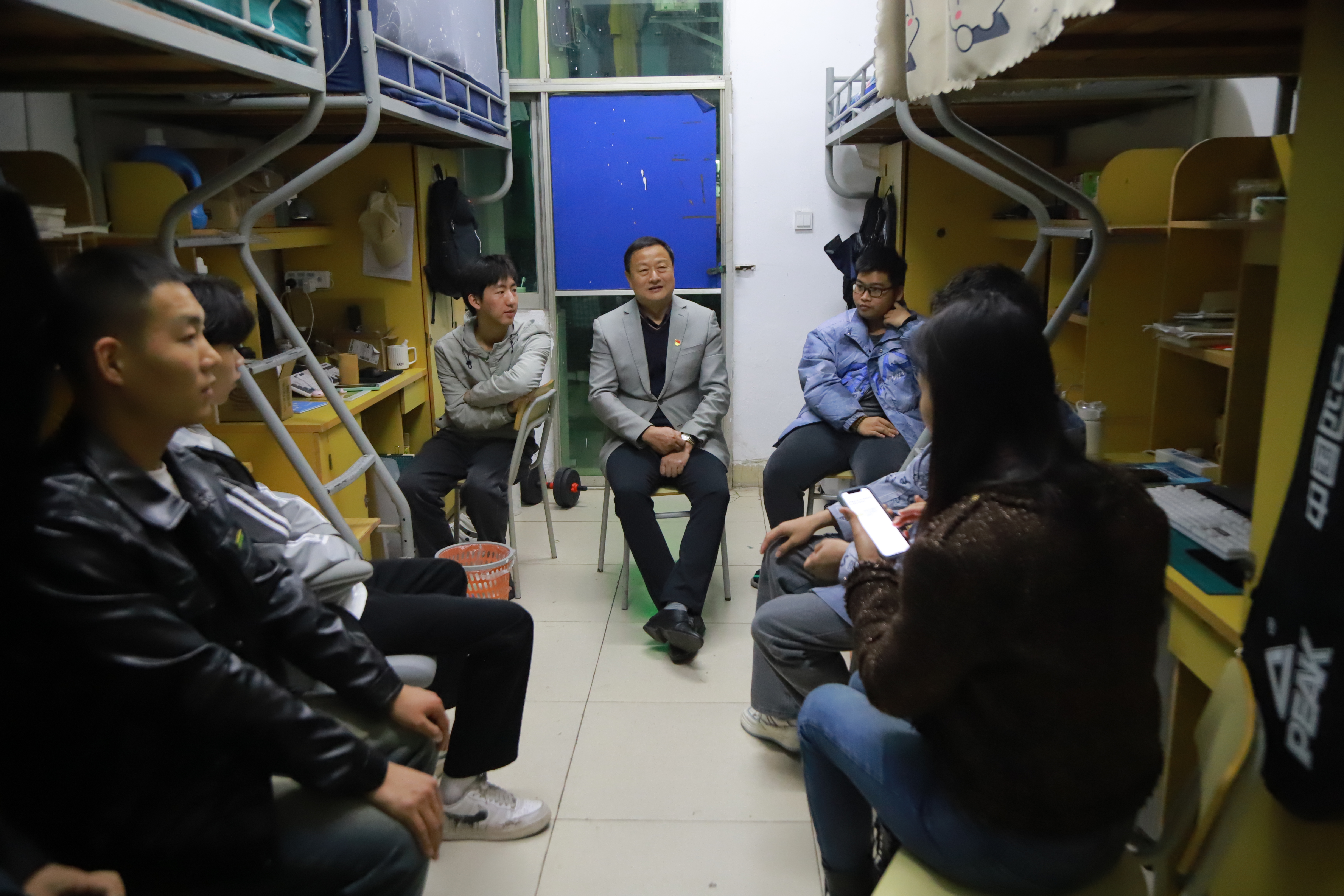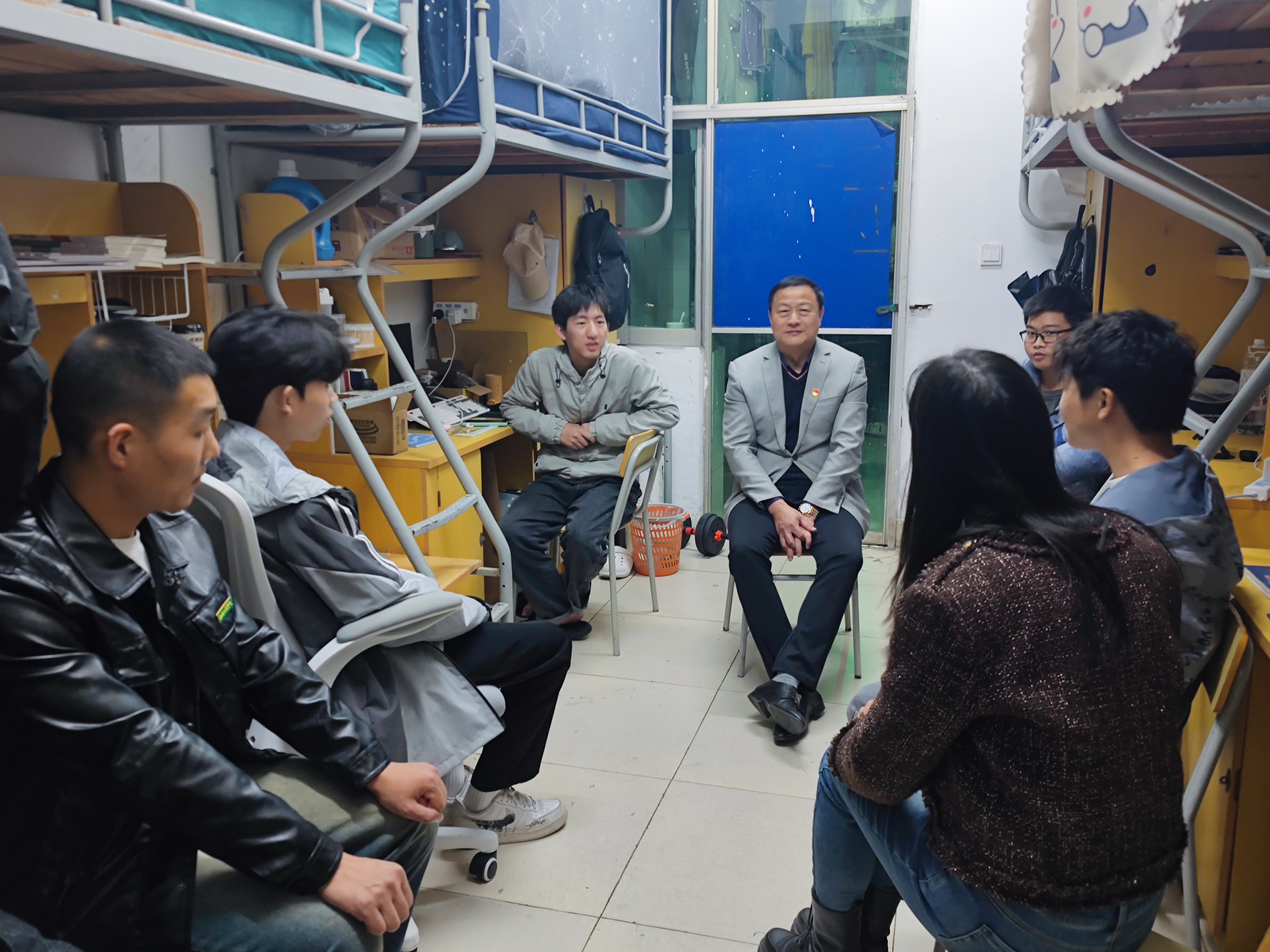 “你们最近学习生活还好吗?”“有没有什么困难?”胡涌来到联系的天工校区9栋415学生宿舍看望学生,与同学们亲切交流,了解同学们学习生活情况,共话成长、共说未来。“感谢胡书记来看望我们,最近学校体育馆增放了乒乓球桌,还延长开放时间,我们能更好地锻炼身体了,学校食堂饭菜质量也提高了,我们在这学习生活得很开心”。温馨愉悦的现场氛围,轻松自在的交流方式,成为校领导与同学们敞开心扉的一次“家常谈心”。