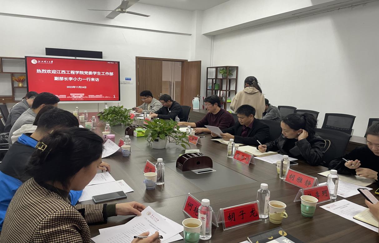 11月24日下午,江西理工大学党委学生工作部部长贾群燕主持召开座谈交流会并致辞,对我校一行表示热烈欢迎。贾群燕部长介绍了学校发展历程、人才培养、社会服务、辅导员队伍建设等方面的情况。李小力副部长表示开展这次校际交流的目的就是围绕学生工作中的“重点”“难点”“痛点”问题,到贵校取经学习,学习特色经验,发挥优势,就学生工作经验和未来发展方向等方面互通想法,为辅导员队伍发展作出积极贡献。江西理工大学学生工作部副部长刘黎明、孟冲及相关人员参加了交流会。