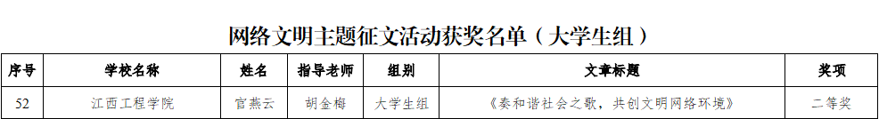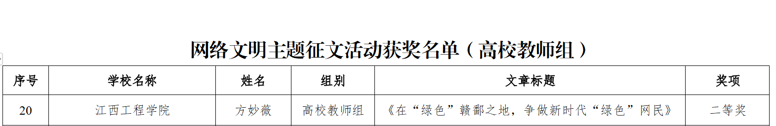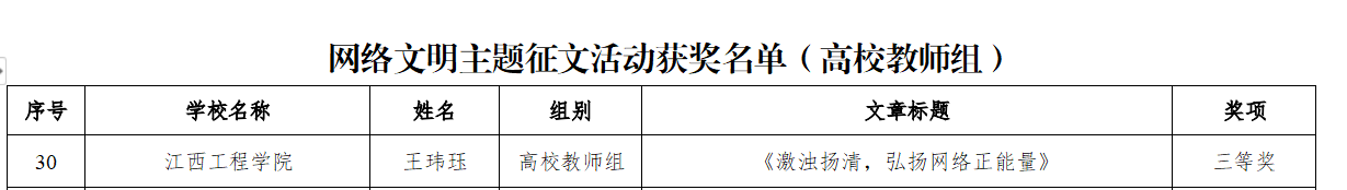 近日,江西省网络文明主题征文活动结果已公示,根据省委教育工委、省教育厅《关于开展网络文明主题征文活动的通知》(赣教宣字〔2023〕11号),经单位推荐、专家组评审,共评选出网络文明主题征文作品一等奖42项、二等奖90项、三等奖132项。其中我校马克思主义学院教师方妙薇撰写的征文《在“绿色”赣鄱之地,争做新时代“绿色”网民》荣获高校教师组二等奖,语言与传播学院教师王玮珏撰写的征文《激浊扬清,弘扬网络正能量》荣获高校教师组三等奖,语言与传播学院学生官燕云撰写的征文《奏和谐社会之歌,共创文明网络环境》荣获大学生组二等奖。其中,高校教师组获奖篇数在全省民办本科院校中与南昌大学科学技术学院并列第一。