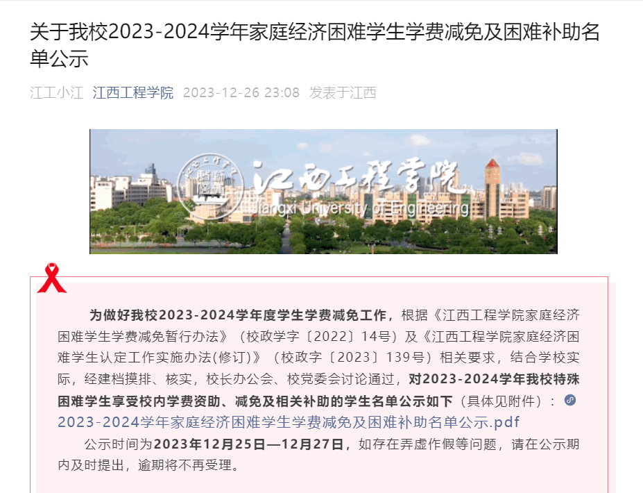 学校一直以来多举措关注贫困学生及弱势群体,设立多项帮扶资金,搭建了全时段资助服务平台,即在入学前,随录取通知书寄送国家和学校资助政策宣传册,通过电话、家访等摸清新生家庭经济情况;入学时,开通“绿色通道”,对经济困难新生先办理入学手续,并提供临时困难补助和应急基金;入学后,启动“奖、助、贷、勤、免、补、资、偿”资助模块,免除学生在校学习的后顾之忧。在国家政策对他们的帮扶外,学校从事业收入中提取专项资助资金,用于家庭经济困难学生学费减免、勤工助学等资助项目,2023年12月,学校为帮扶困难学生,关爱弱势群体,又从学校资金中拿出近300万元用于发放困难学生帮扶,真正落实了“不让一个困难学生因家庭经济困难而辍学”的社会责任。