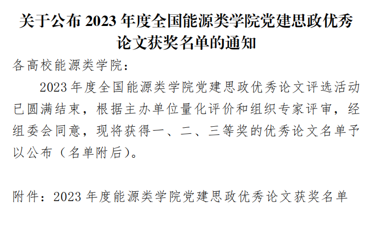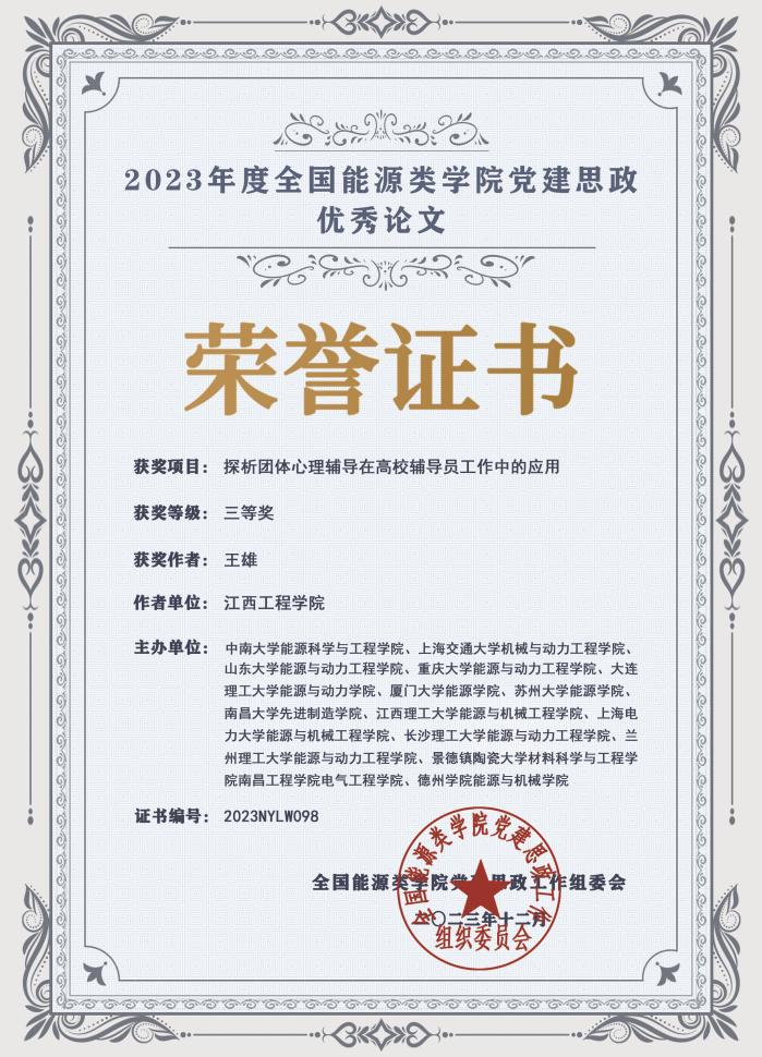近日,2023年度全国能源类学院党建思政优秀论文评选结果揭晓,我校语言与传播学院辅导员王雄的论文《探析团体心理辅导在高校辅导员工作中的应用》获评三等奖。