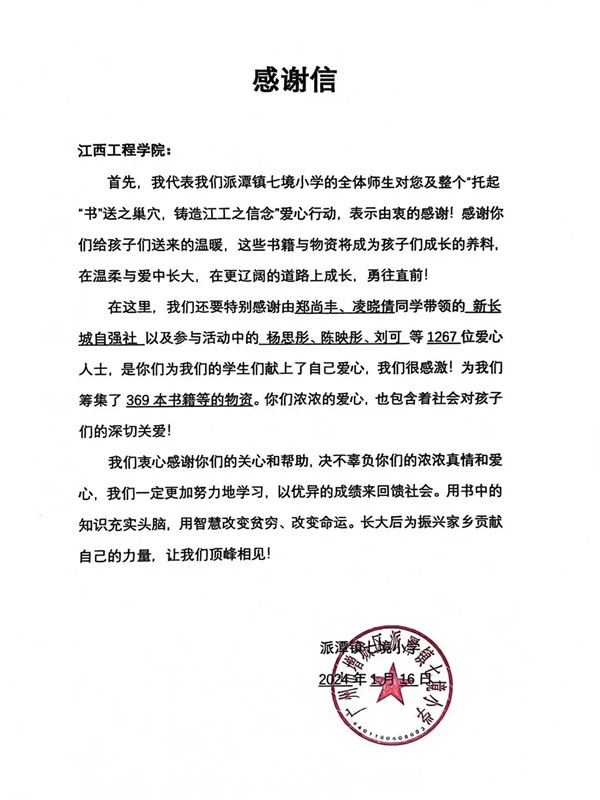 为给予留守儿童温暖与关怀,帮助和服务留守儿童健康成长,激发了他们对美好生活的憧憬和向往,让他们切实感受到来自校园和社会的关怀,以更加积极的心态投入到生活和学习中,保持对生活和学习的热爱。让人有书看,让书被人看,让书成为一种力量。学校组织开展“托起‘书’送之巢穴,铸造江工之信念”主题活动。