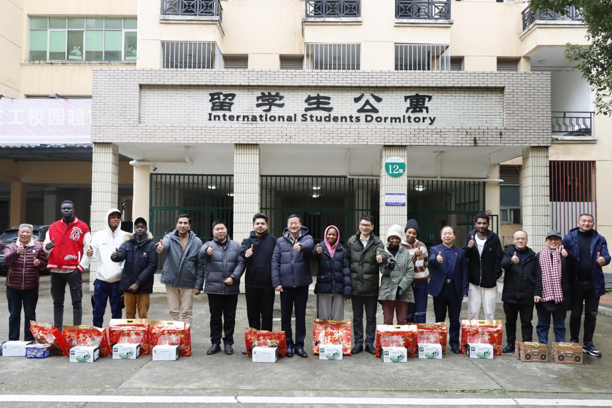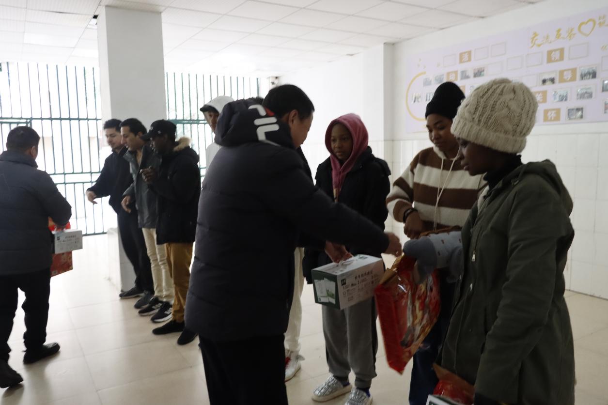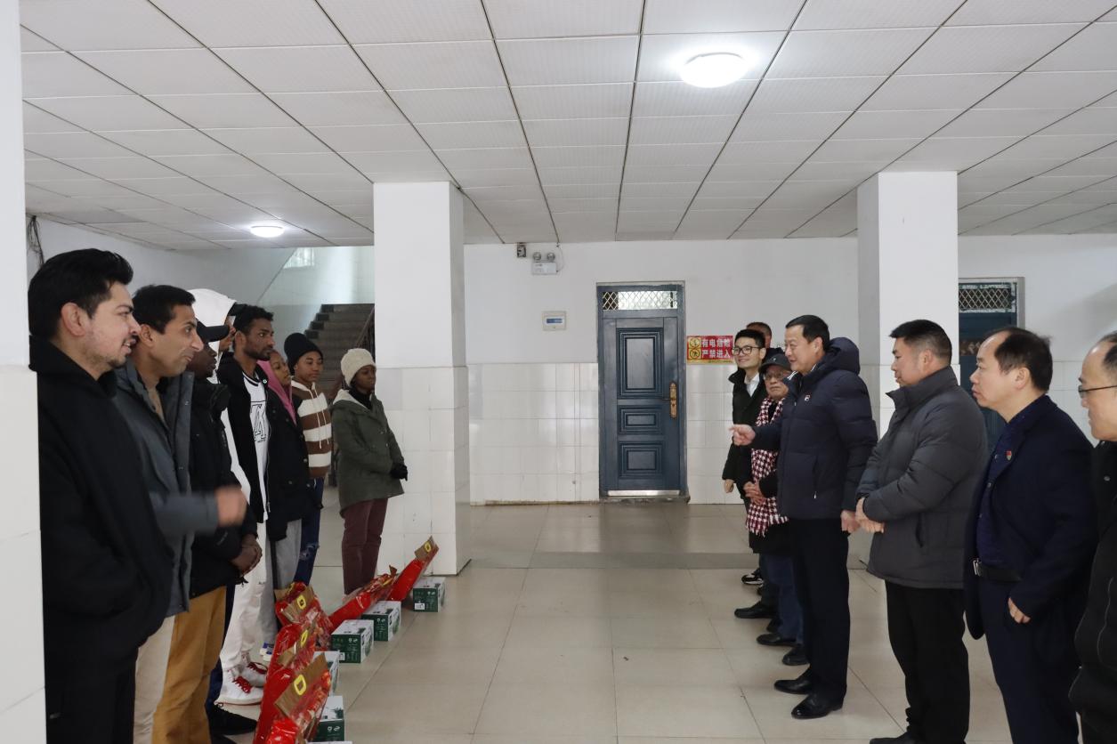 玉兔呈欢辞旧岁,神龙跃起展鸿猷。2月8日,在新春佳节即将来临之际,为让留学生感受到学校的关怀和温暖,感受中国春节的浓郁氛围,更好地认识中国、读懂中国、爱上中国,学校党委书记、督导专员胡涌,党委委员、董事长助理、校长助理乐俊杰,党委委员、校长助理邹建民一行来到留学生公寓,看望慰问在校留学生,为他们送去热情洋溢的新春问候和祝福,并发放了新年礼物。党委办公室、宣传部、保卫处负责人和国际教育学院教师陪同。