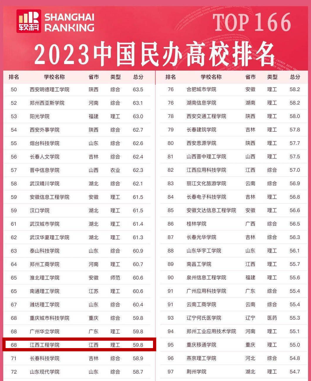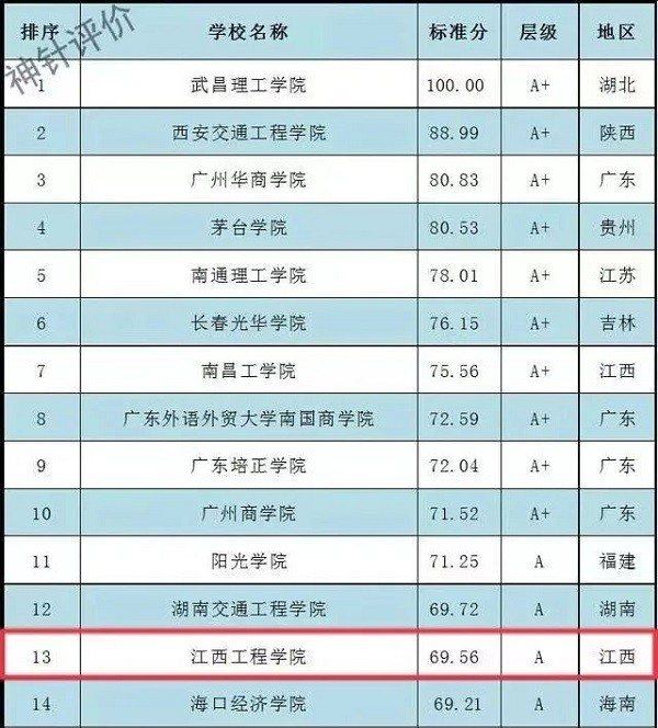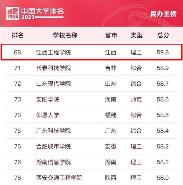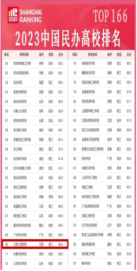 在神针评价(SZPJ)公布的《中国民办本科院校科研竞争力排名(2023年)》中,学校在385所普通民办院校中排名较前几年持续上升,位列第13位。2023年2月,《中国民办院校排行榜》公布,共有166所民办院校上榜,学校位列第68位(理工类),学校位列中国民办大学占地面积排名第52位;2023年ABC中国民办大学排行榜我校位列全国第91位,比上一年上升6位,在江西上榜的8所名办高校中位列第四;学校入围省级节水型高校候选名单;区块链工程专业位列中国大学分专业竞争力排行榜应用型第2名、综合第4名。