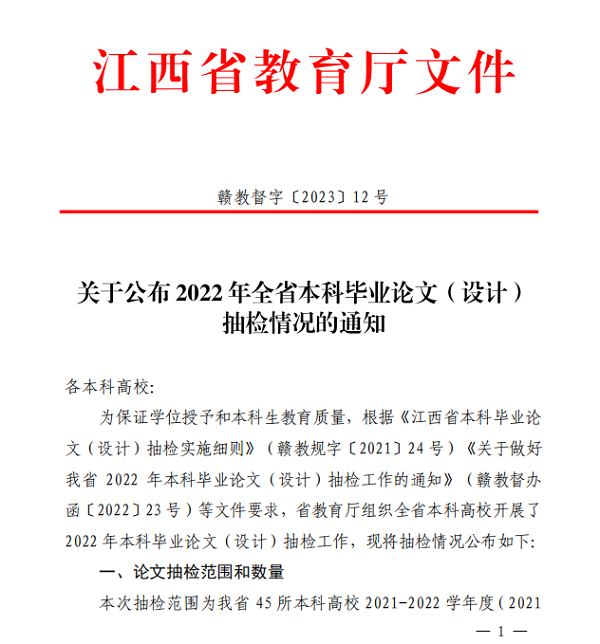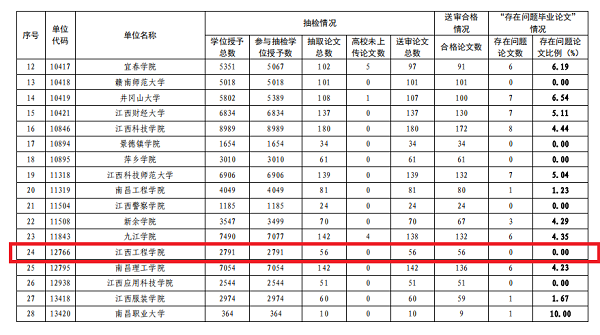 根据省教育厅《关于公布2022年本科毕业论文(设计)抽检情况的通知》,全省45所本科高校按2.01%的标准抽检3500篇毕业论文(设计),全部抽检合格的高校只有9所,我校是9所全部合格的高校之一。