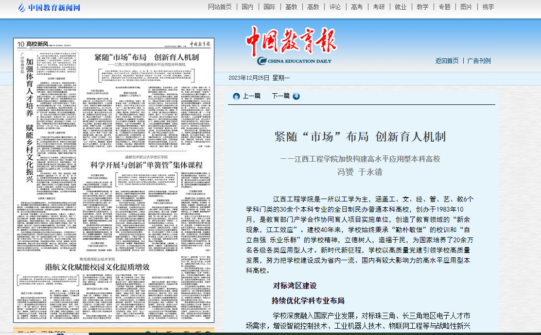 学校聚焦江西省“1269”和新余市“6313”重点产业,围绕数字经济“一号发展工程”,主动面向区域、面向行业、面向产业办学,促进教育链、人才链与产业链、创新链有机衔接,建立了6个校级现代产业学院,包括智能制造产业学院、ICT产业学院、数字经济产业学院、新一代电子信息产业学院等4个重点现代产业学院和智慧产业学院、仙女湖艺术文旅产业学院等2个现代产业学院培育项目,其中智能制造产业学院成功入选第二批江西省现代产业学院培育项目,全省仅3所民办本科院校入选。21个项目获教育部产学合作协同育人项目立项。