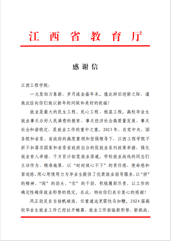 学校全面贯彻落实党中央、国务院和省委、省政府关于高校毕业生就业创业工作的决策部署,这一封信不仅是对我校就业工作的认可,也表明了学校一直以来对于就业工作的重视与坚持。2024年,学校将坚持以“促进毕业生更加充分、更高质量就业”为目标,不断创新工作思路,完善工作机制,提高工作水平,进一步强化就业育人建设,引导大学生树立正确的就业观和择业观,为学生提供更优质、更精准、更高效的就业服务,促进毕业生高质量充分就业。