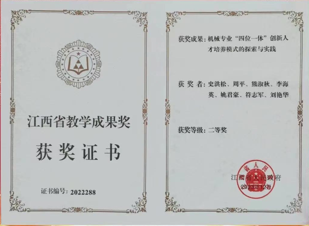 学校2023年获得省政府颁发的教学成果二等奖。智能制造与能源工程学院史洪松教研团队的《机械专业“四位一体”创新人才培养模式的探索与实践》获江西省教学成果二等奖。这是江西省政府首次颁发教学成果奖,我校系四所民办本科院校获奖之一。智能制造与能源工程学院史洪松主持的《UG(机械产品设计)》成功申报国家级线上线下混合式一流本科课程。