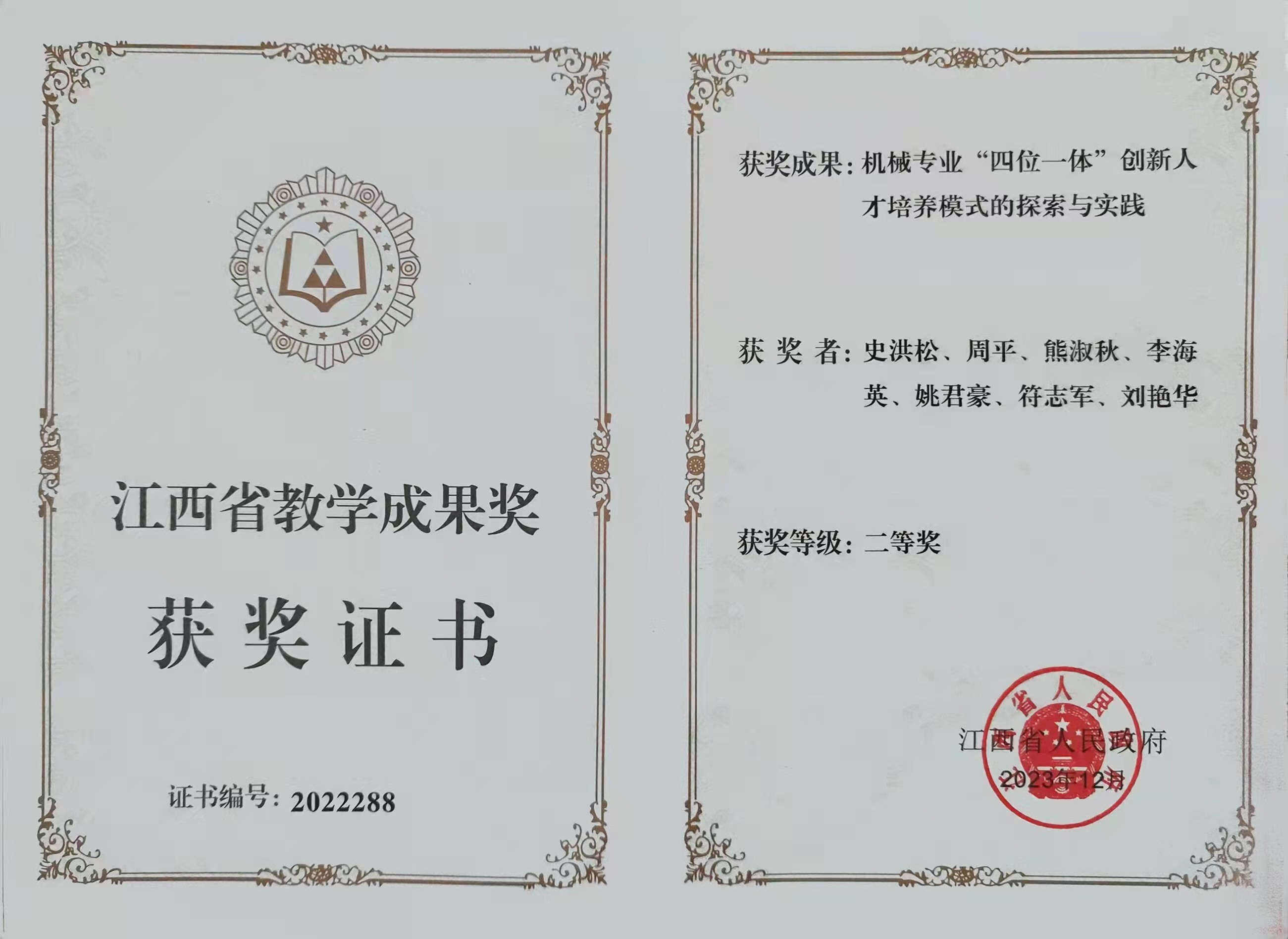 学校2023年获得省政府颁发的教学成果二等奖。智能制造与能源工程学院史洪松教研团队的《机械专业“四位一体”创新人才培养模式的探索与实践》获江西省教学成果二等奖。这是江西省政府首次颁发教学成果奖,华亿平台系四所民办本科院校获奖之一。智能制造与能源工程学院史洪松主持的《UG(机械产品设计)》成功申报国家级线上线下混合式一流本科课程。