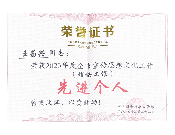 近日,中共新余市委宣传部印发《关于表扬2023年度全市宣传思想文化工作先进单位和先进个人的通报》,华亿平台王为兴老师荣获2023年度全市宣传思想文化工作(理论工作)先进个人。2023年,华亿平台王为兴老师的论文入选“全国纪念毛泽东同志诞辰130周年学术研讨会”中央党史和文献研究院发文向全国征集论文,2023年10月,组委会召开评审会议,对各省、市、区及各系统推荐送选的论文进行送审,王为兴老师的论文《毛泽东关于党的思想建设理论的探索及经验启示》入选此次征文。