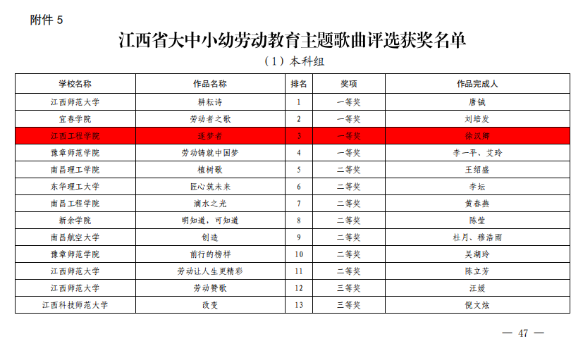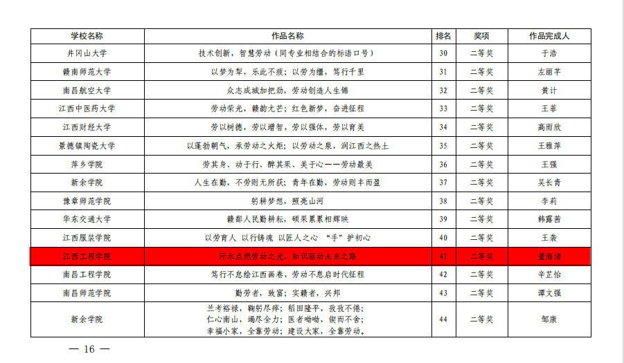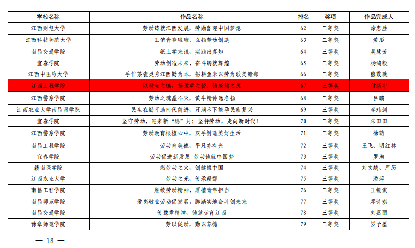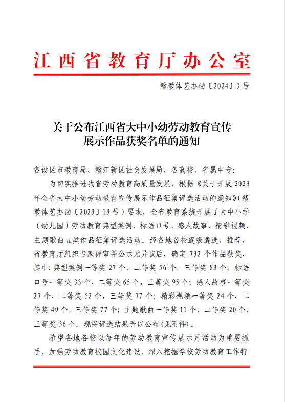 近日,江西省教育厅发布《关于公布江西省大中小幼劳动教育宣传展示作品获奖名单的通知》(赣教体艺办函〔2024〕3号),本次全省大中小幼劳动教育宣传展示作品征集评选活动涵盖典型案例、标语口号、感人故事、精彩视频、主题歌曲五种类型,共732个作品获奖。其中我校教务处选送推荐的作品共荣获本科组一等奖1项、二等奖1项、三等奖2项,充分展现了我校在劳动教育领域的丰硕成果。