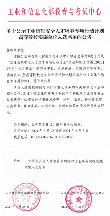 近日,工业和信息化部教育与考试中心发布了《关于公示工业信息安全人才培养专项行动计划高等院校实施单位入选名单的公告》。经过严格的院校申报、组织遴选、分组答辩和专家评审等环节,最终确认了全国48所高等院校为首批专项行动计划实施单位。全省仅南昌大学、江西警察学院、东华理工大学和我校四所本科院校入选,民办本科院校仅我校一所。这不仅是对我校在信息安全领域教育教学工作的充分肯定,也是我校在人才培养方面取得的又一重要成果,更是对我校整体办学实力和人才培养水平的认可。