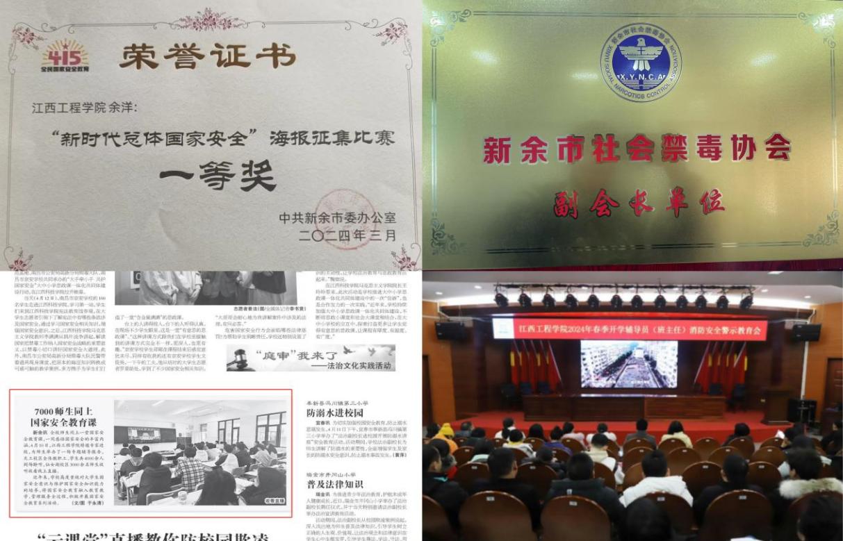 我校一直以来高度重视公共安全教育,旨在全面提高学生的安全意识和防范能力,为建设平安和谐校园奠定坚实基础。开学初,全校师生集中观看了安全教育视频和开展了消防逃生半实战化演练。同时,在新余市委办公室组织的“新时代总体国家安全”海报征集比赛中,我校抱石艺术学院余洋同学荣获“新时代总体国家安全”海报征集比赛一等奖。我校国家安全教育活动被多家媒体报道,并在江西省新法治报“平安法治校园”版块上进行了刊登。2024年,我校成为新余市社会禁毒协会副理事长单位。