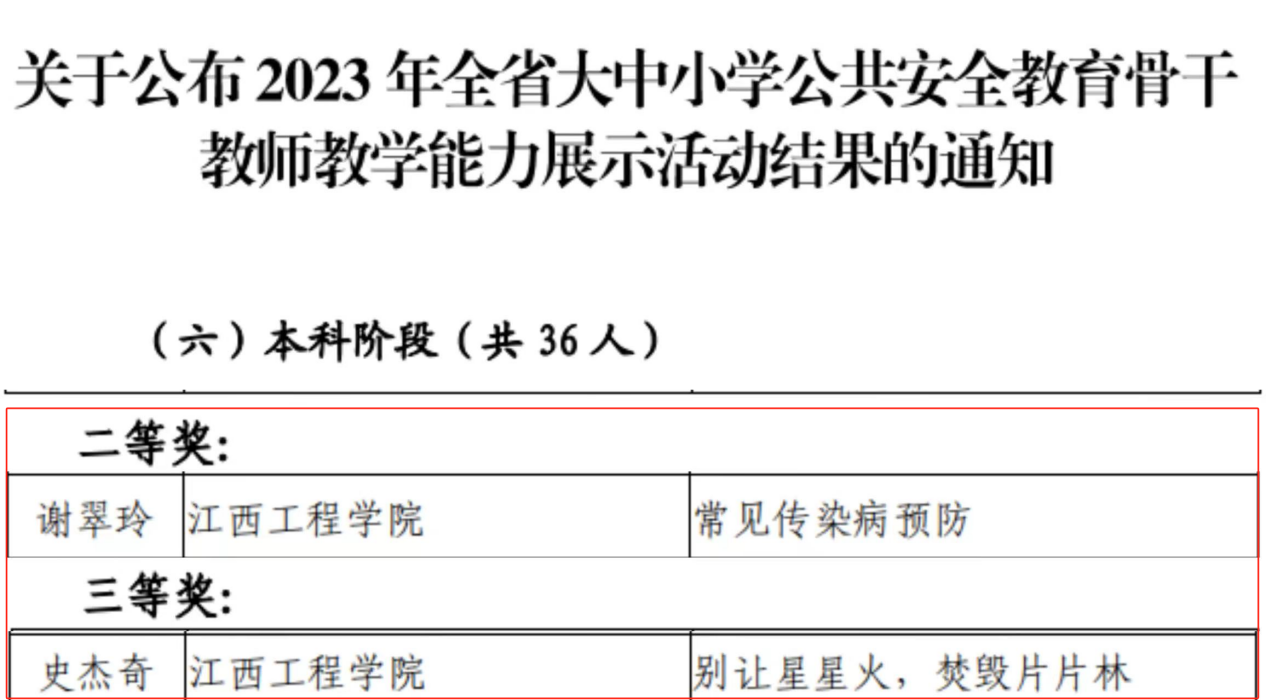 近日,由江西省教育厅举办的2023年全省大中小学公共安全教育骨干教师教学能力展示活动评审结果出炉,此次教学能力展示活动共有300多名教师参赛,共评选出一等奖35项、二等奖68项、三等奖100项,我校教育与健康管理学院教师谢翠玲、史杰奇在此次大赛中分别荣获本科阶段教师组二等奖和三等奖。