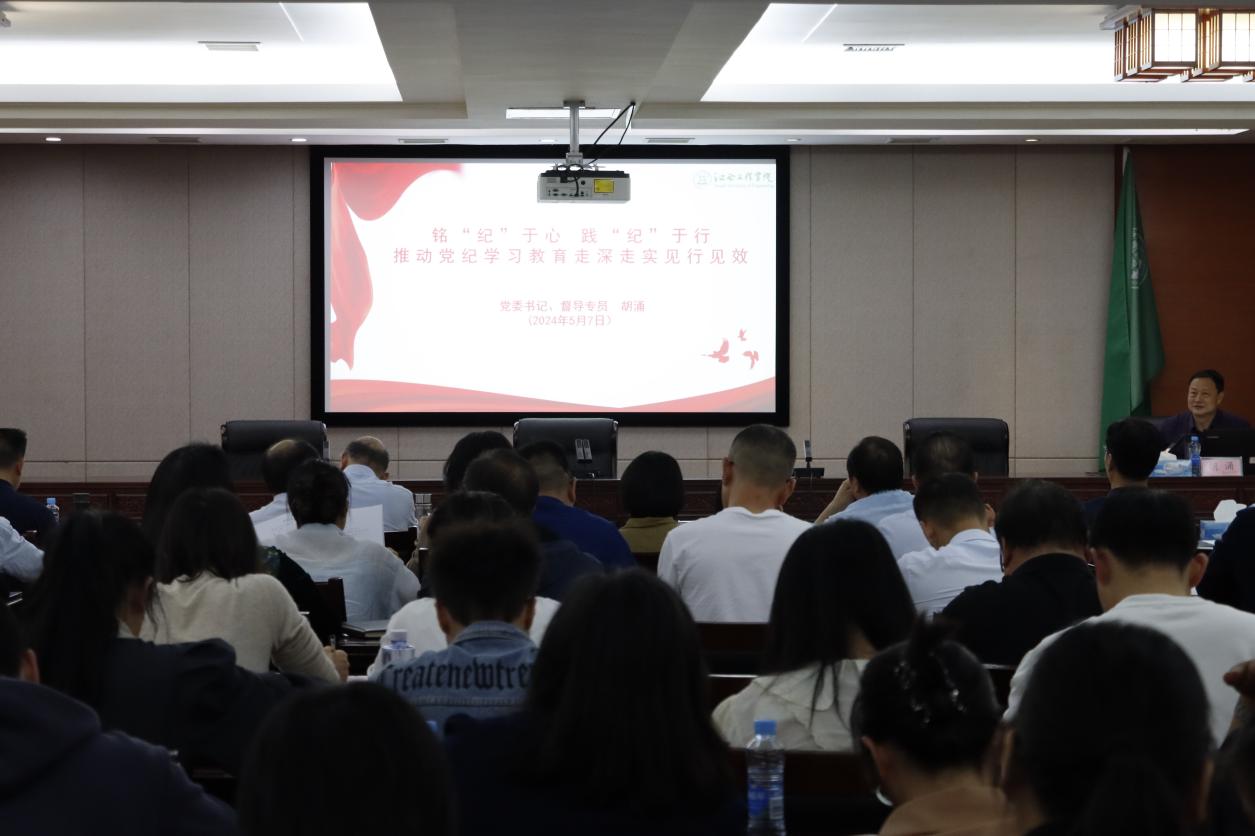 胡涌书记从“高度重视党纪学习教育是我们党的优良传统”“扎实开展党纪学习教育纵深推进全面从严治党”“切实将党纪学习教育成效转化为学校高质量发展实效”三个方面,深刻分析了党纪学习教育的重大意义,详细解读了新修订《中国共产党纪律处分条例》,对党员干部如何抓好廉洁自律提出希望和要求。