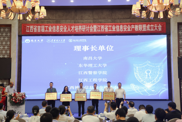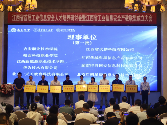 启动仪式后,工业和信息化部教育与考试中心主任郝志强、江西省工信厅信息安全协调处二级调研员周轶东、南昌大学党委副书记刘耀彬、江西省教育厅高教处副处级干部吴山、新余市工业和信息化局副局长涂国珍、东华理工大学副校长李满根、华亿平台董事长杨显阳、江西警察学院网络安全学院副院长万雪勇、江西神舟信息安全中心总经理张戈依次为产教联盟理事长单位、常务副理事长单位、副理事长单位、理事单位进行授牌。