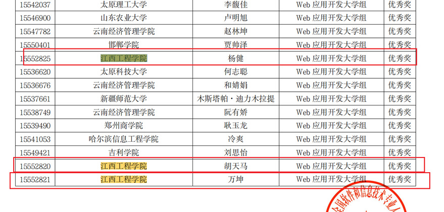 此外,杨健、胡天马、万坤三位同学也在Web应用开发大学组比赛中获得了优秀奖。他们在比赛中展现出了对Web开发技术的熟练掌握和创新能力,成功完成了多个具有挑战性的任务。他们的表现不仅为学校增添了荣誉,也为自己在Web开发领域的发展奠定了坚实的基础。