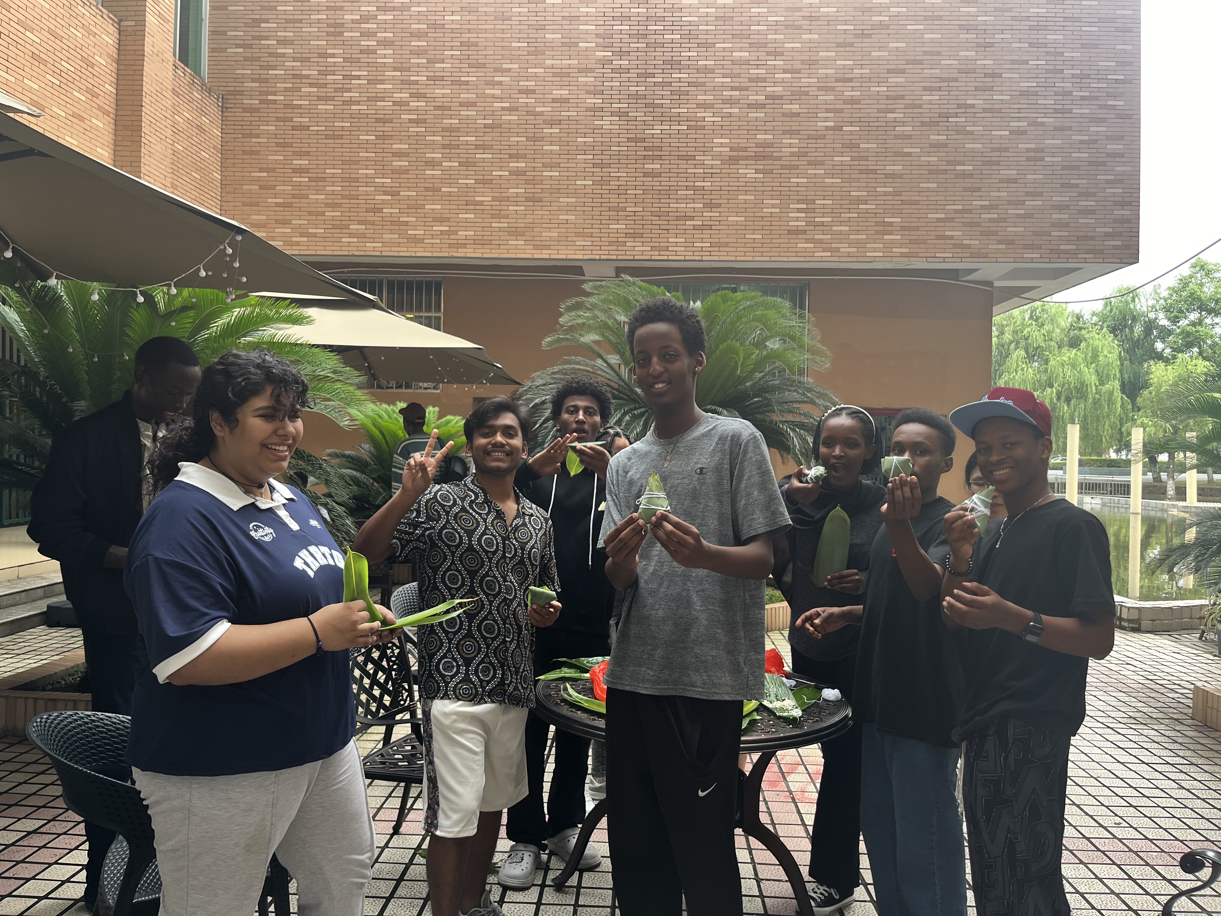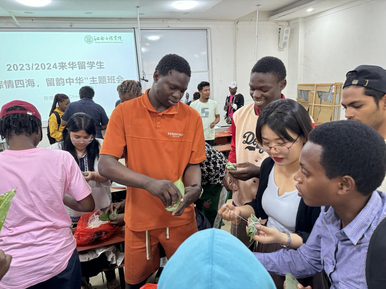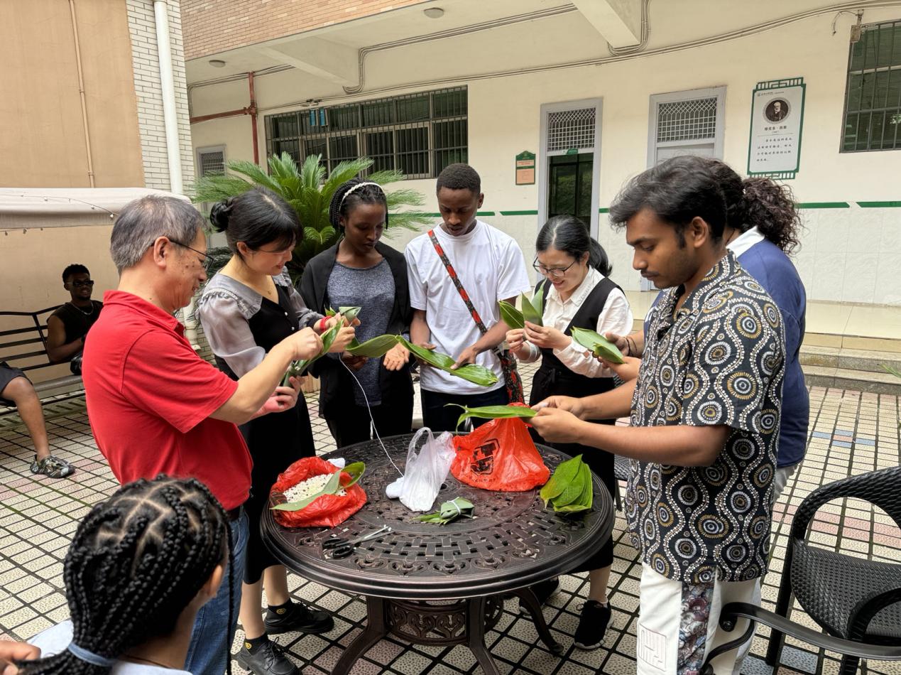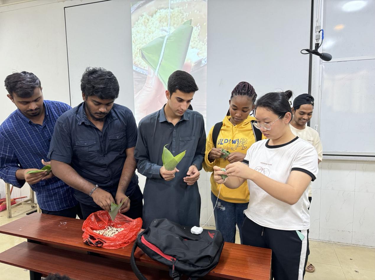 在老师们的指导下,留学生们纷纷挽起袖子,亲手尝试包粽子。虽然开始时手法生疏,但在不断的练习和老师的悉心指导下,大家逐渐掌握了包粽子的技巧。现场气氛热烈,留学生们一边包粽子,一边交流学习心得,不仅锻炼了动手能力,还增进了彼此之间的友谊。