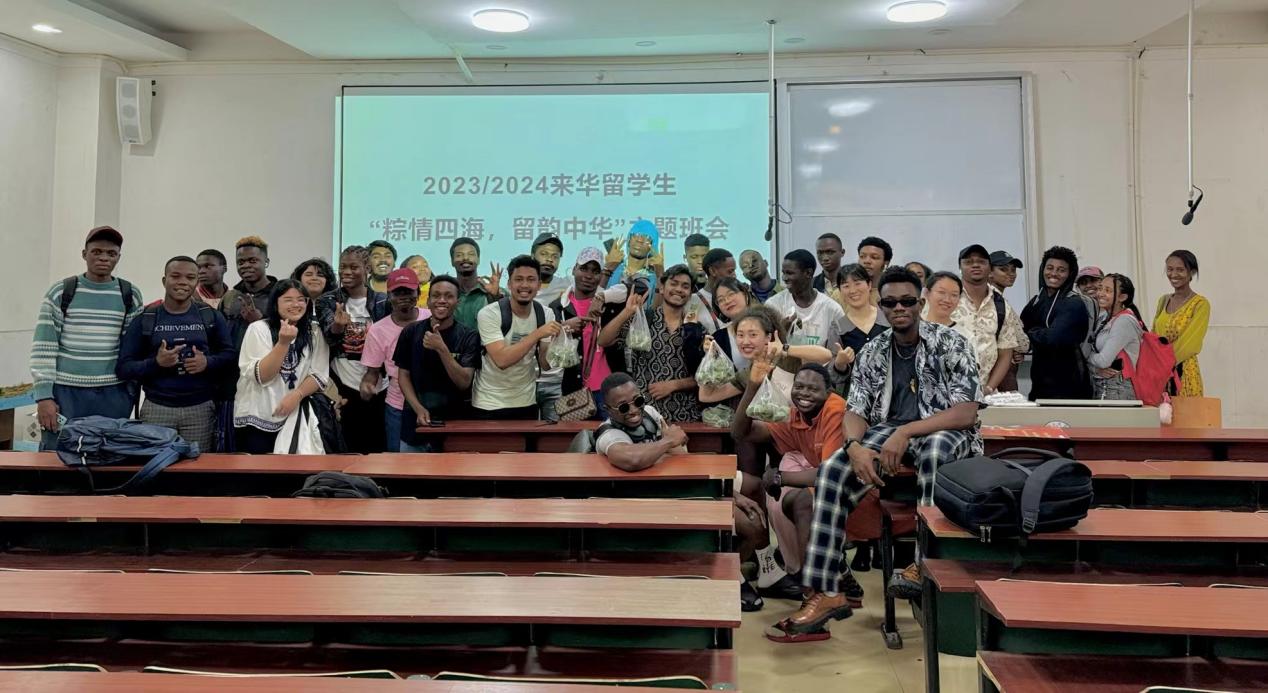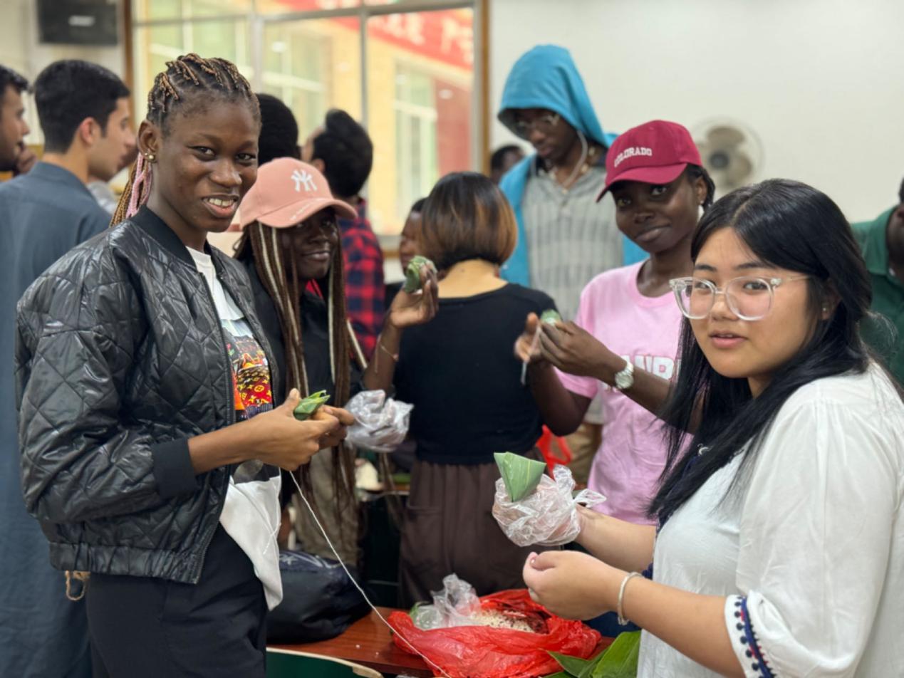 大家在这里欢聚一堂,热闹非凡,国外留学生们对中国丰富多彩的习俗产生了浓浓的兴趣,“将粽叶折出一个斗,抓一把米填入,放一块有肥有瘦的五花肉,再抓一把米把五花肉埋住,长边叠叶,再加一片粽叶,包成长形,再用细绳将粽叶捆好,手里面一只只棱角分明的粽子就诞生了。”来自喀麦隆留学生史丹利高兴地说,“端午节要吃粽子,真没想到能和老师们一起学习包粽子,众多的活动,让我对中国的认知也越来越广,越来越深,对我来说很有意义,也希望了解更多的中国传统文化。通过这次活动,他们更加深刻地感受到了中国传统文化的魅力,也更加珍惜在中国留学的时光。”