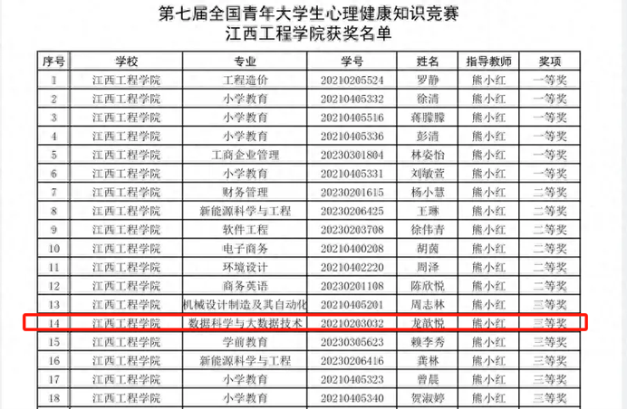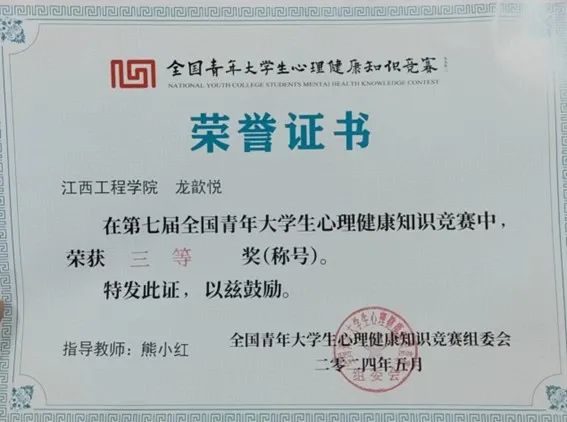 为进一步宣传普及青年大学生心理健康知识,提高青年大学生心理健康意识、心理防护意识和自我心理调适能力,促进青年大学生心理健康发展,营造良好的校园心理健康文化氛围,我校大数据与计算机学院积极动员,精心组织学生参加第七届全国青年大学生心理健康知识竞赛,2021级数据科学与大数据技术本科一班龙歆悦荣获三等奖。