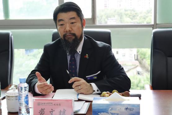 随后,裘文斌高度评价了我校在教育教学和国际化办学方面取得的成就,并介绍了博士山学院在国际教育领域的优势与特色。裘文斌表示,两校在办学理念、学科设置等方面有着诸多相似之处,同时也各具特色,这为双方的合作提供了广阔的空间。他期待两校能够加强交流,共同探索国际教育合作的新模式、新途径。