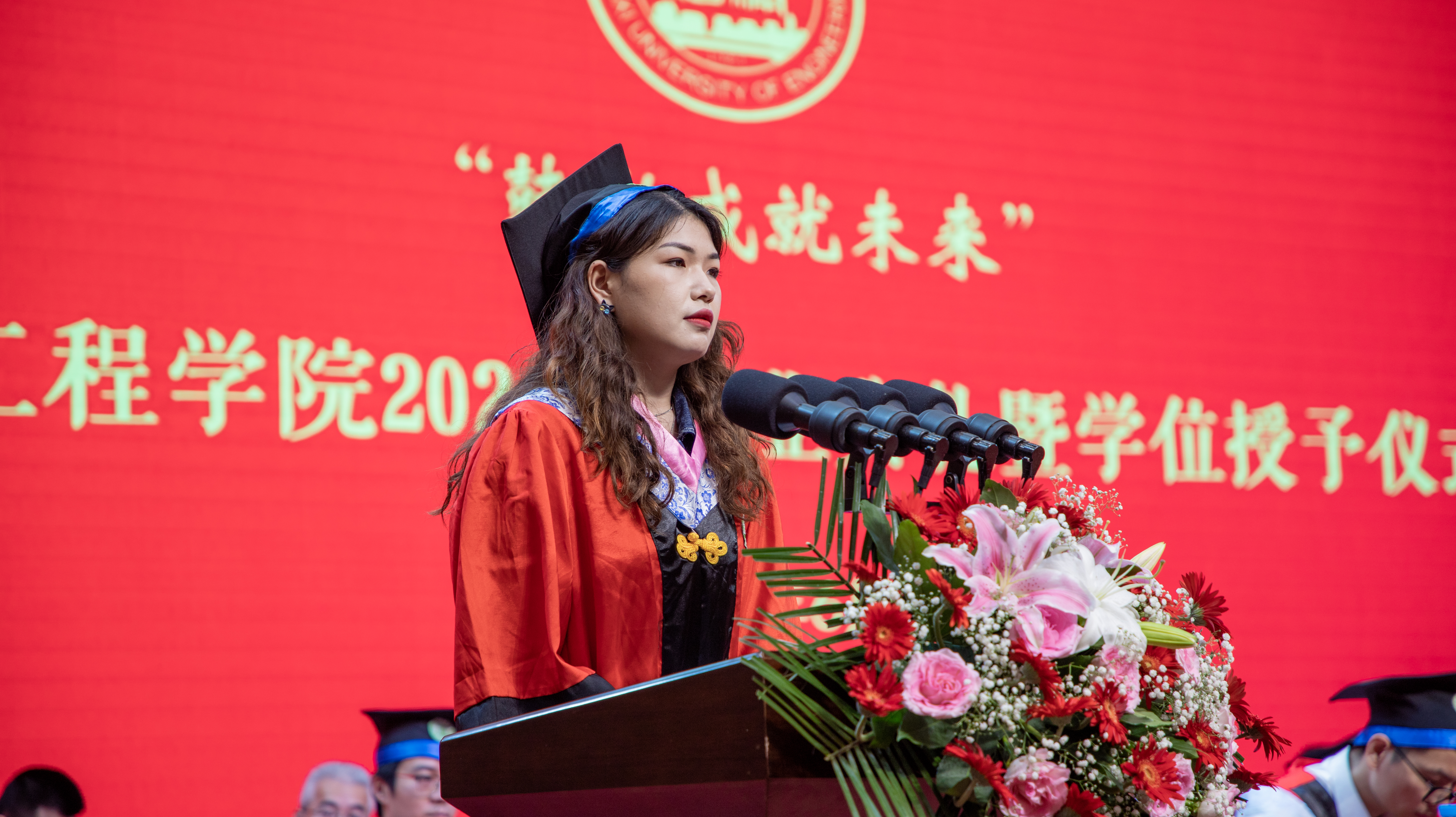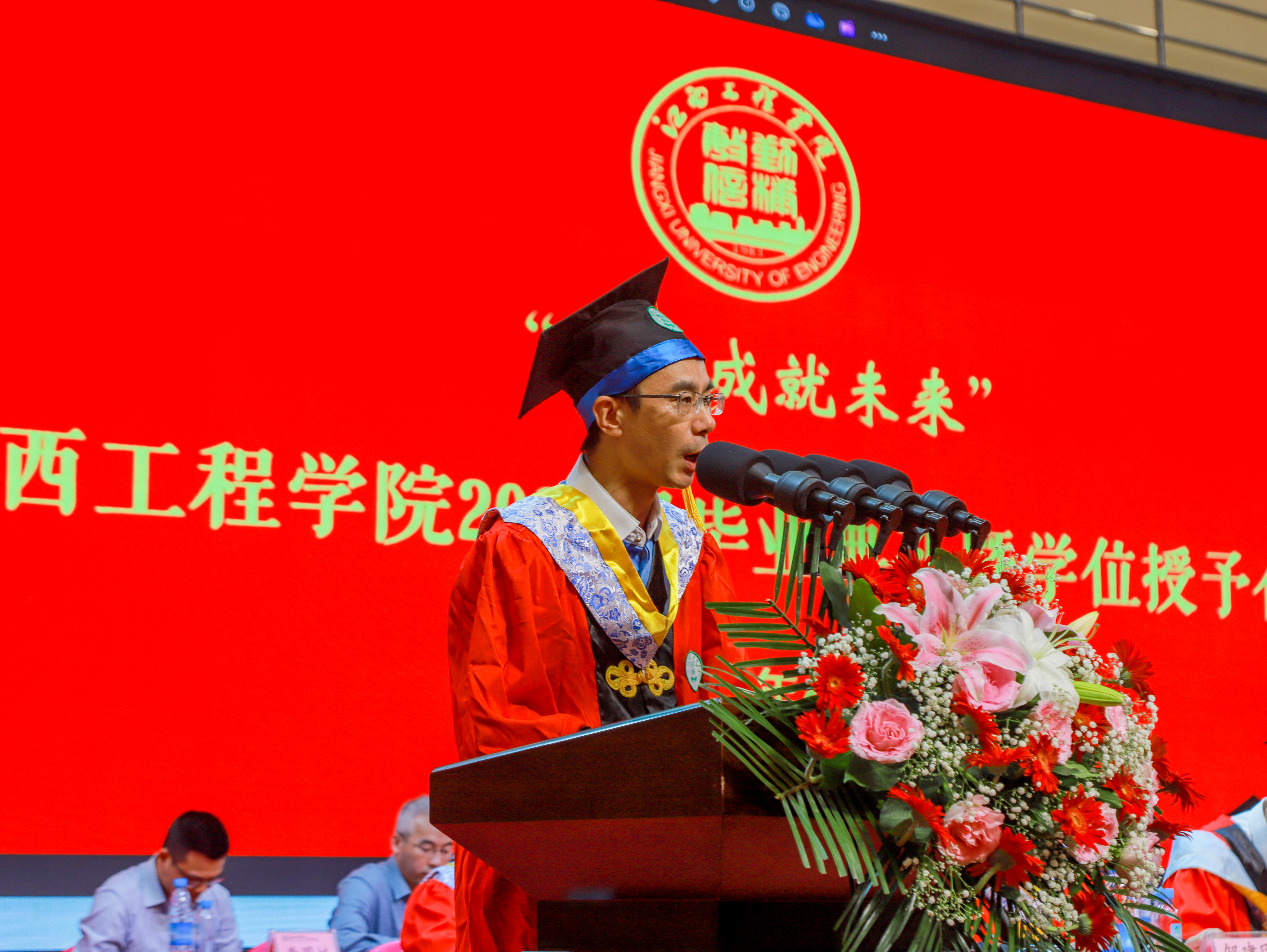 毕业生代表徐阳阳号召江工学子用奋斗和拼搏擦亮鲜明的青春底色,把青春融入时代洪流,不负韶华、不负母校期待。并祝福母校蒸蒸日上、再创辉煌。