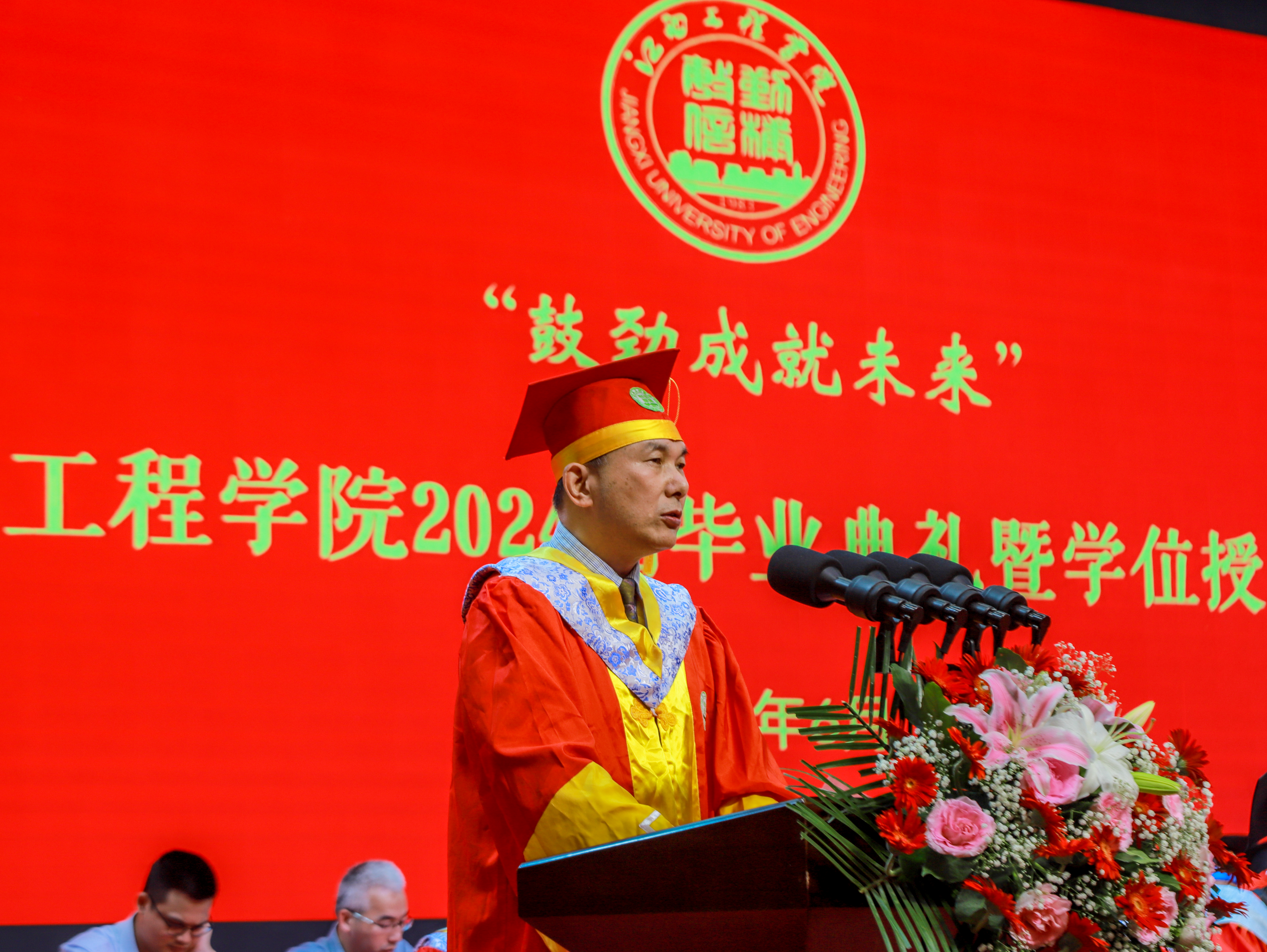 史焕平校长强调,2024届同学特别不容易。入校之初,同学们就遭遇新冠肺炎疫情的严峻考验,大家一起做核酸、报体温、亮绿码,在封闭的校园里守望相助,千余名同学积极投身志愿者行列,用最无畏的勇气和最执着的信念构筑起齐心战疫的坚固防线;2024届同学特别有内涵。同学们在学校开展的“青春践行二十大”“诵读红色家书,赓续红色血脉”“不负时代、青春有我”等主题教育中踊跃参与,培育了爱党爱国、奋斗强国之心,热情参与学校文艺汇演、校园好声音和大学生社团活动,诠释了新时代江工的校园文化内涵。同学们在收获成功喜悦的同时,也引领了学校良好的校风学风,展示了新时代江工学子的风采;2024届同学特别敢创新。近年来,同学们在全国数学建模大赛、“互联网+”大学生创新创业大赛、全省大学生电子设计大赛等重大赛事中,不畏强手,屡屡过关斩将、取得佳绩,在获得自身荣誉的同时,也一次次提升了江工的社会影响力。