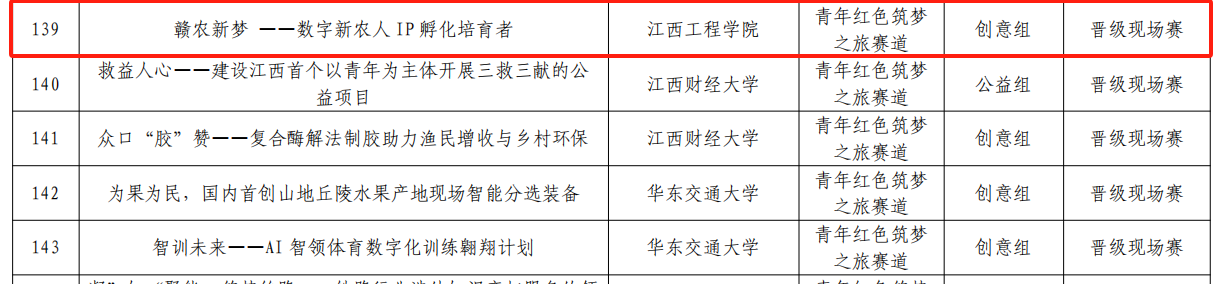 根据《关于举办“建行杯”江西省大学生创新大赛(2024)暨全国大赛选拔赛的通知》(赣教高字〔2024〕26号)要求,7月12日至15日,大赛评审委员会组织专家对全省1634个项目进行了严谨评审。这些项目涵盖了高教赛道675个、红旅赛道378个以及职教赛道581个。经过专家们的严格筛选和专业评估,7月17日,529个拟获奖项目名单得以公布,其中242个项目成功晋级省级决赛,另外287个项目拟获得省级铜奖。