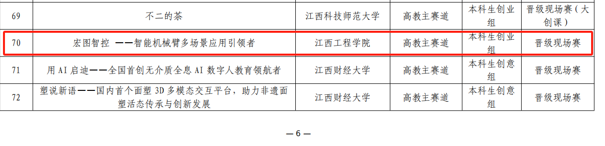 “学校高度重视本次大学生创新大赛,并为备赛提供了有力的保障,赛事启动以来,学校精心组织选拔、训练、模拟,充分发挥团队协作精神,较好地完成了备赛参赛各项工作。本届大赛获得了初步成功,充分展示了学校师生扎实的知识功底和团结协作、奋勇争先的精神风貌。”创新创业学院院长胡志军介绍,下一步,学校将继续秉承创新创业精神,弘扬天工文化,砥砺创新品格,为推动江西省乃至全国的创新创业事业贡献江工力量。期待在省级决赛中,学校宏图智控和赣农新梦2个项目能够再创佳绩,为学校增光添彩!