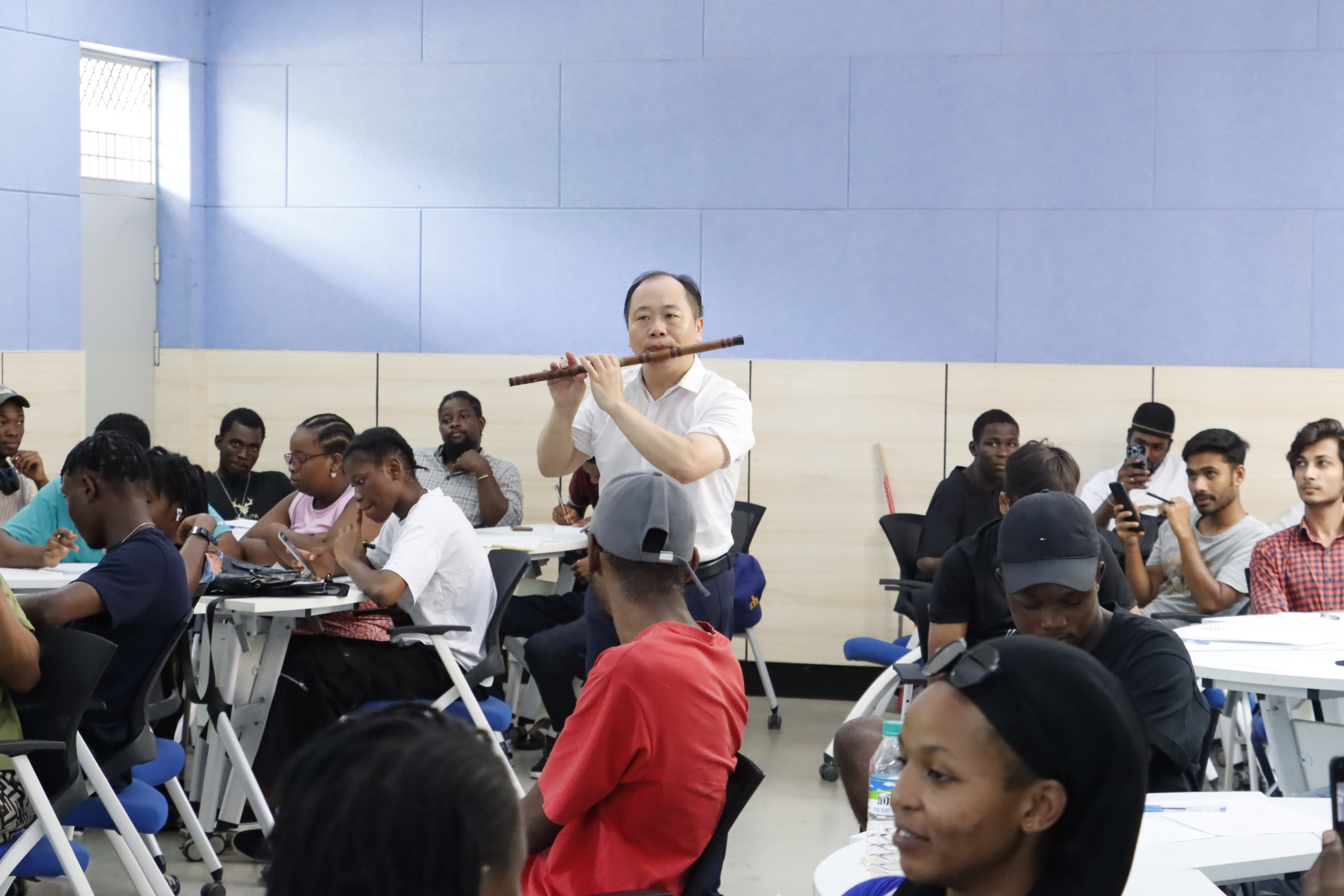 竹笛在中国是一种广为流传的吹奏乐器,顾名思义竹笛都是用天然竹材制成。笛子是带着非常强烈的中国民族特色的乐器,其声音是非常的动情和婉转的,宛弱龙吟,古人也称之为“荡涤之声”。在教师志愿者于永清的吹奏下,《茉莉花》的音符婉转流淌。这优美的旋律,不仅让中国文化的芬芳传遍世界,更以音乐架起了心灵沟通的桥梁,令外国留学生们对中华文化如痴如醉。