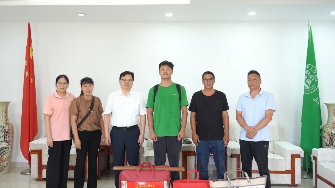 校党委书记、督导专员魏建克在行政楼七楼接待室接见了高分学生代表谢祥斌及其家人,将爱心大礼包送到谢祥斌手中,对谢祥斌及其家人表示衷心祝贺,高度肯定他们的辛勤付出,并表达了对学生在学校成长成才的良好祝愿。魏建克书记寄语学生,希望在即将到来的大学生活中,能够尽快完成角色转换,适应新的学习和生活环境,脚踏实地,苦读耕耘,做好职业规划,将个人梦想融入家庭梦想和社会理想,在青春奉献中发光发热,实现自身价值。