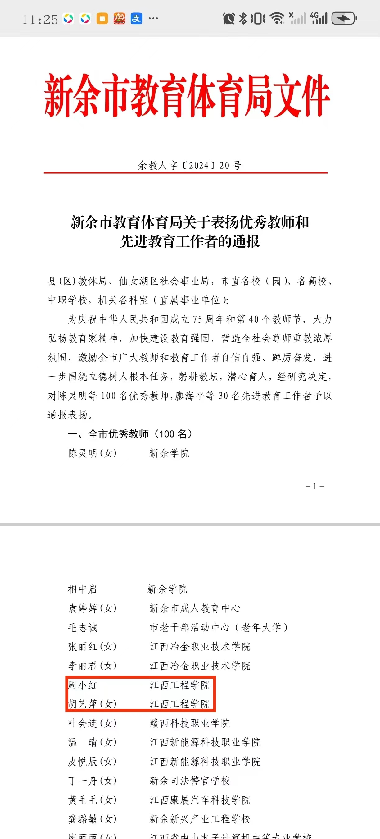根据《新余市教体局关于开展2024年全市优秀教师先进教育工作者评选推荐工作的通知》要求,经逐级推荐,我校周小红、胡艺萍老师被评为2024年新余市优秀教师。