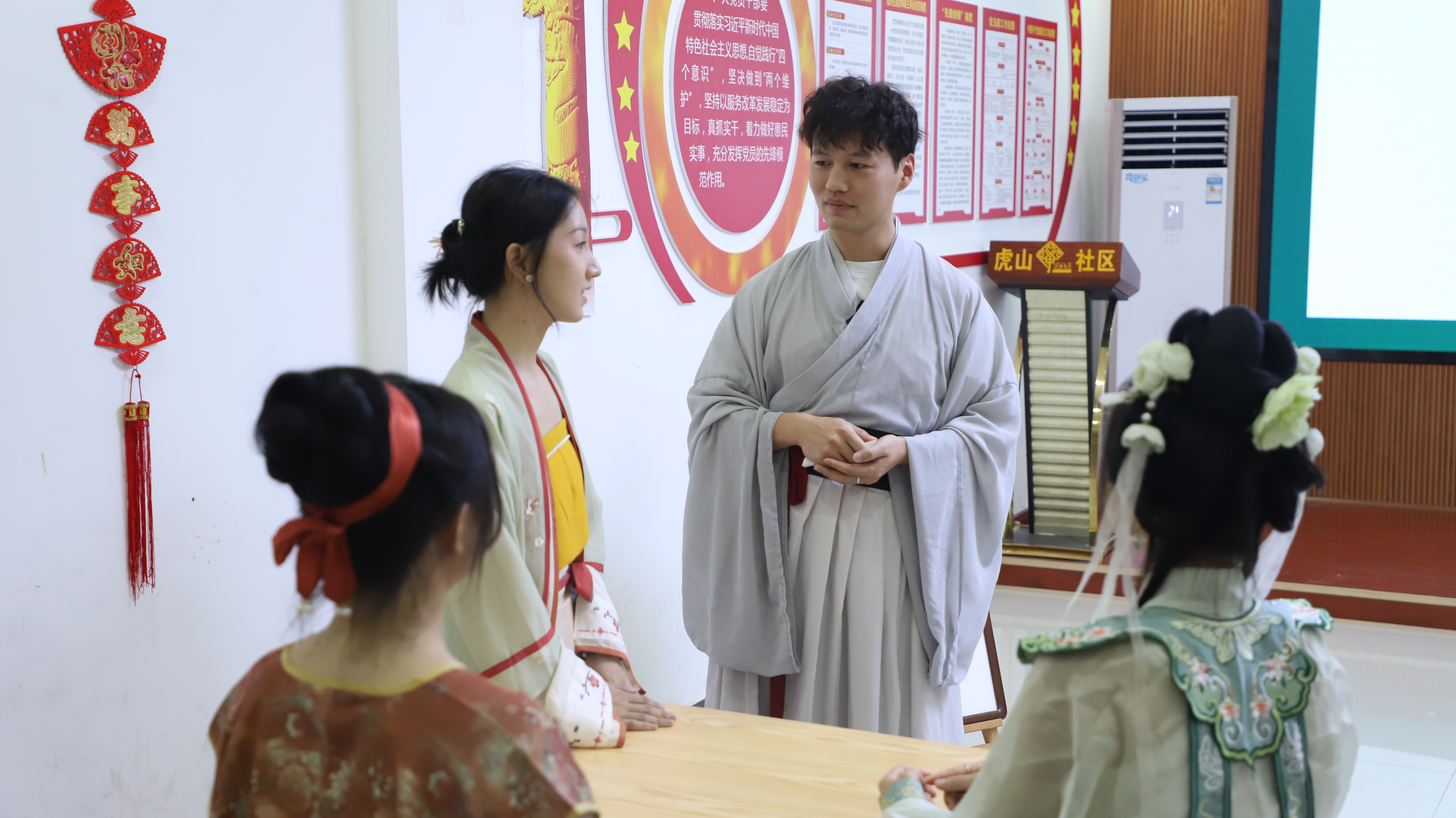 夏布绣,是一个鲜有的以绣地材质命名的绣种,孕育于江西省新余市这片文化沃土,夏布绣以麻为纸,以针作笔、以线代墨的刺绣风格,融合了夏布的自然肌理及绘画的独特神韵,因此夏布绣也被称之为是麻布上的水墨丹青。在虎山社区,同学们和社区居民在学习夏布绣的历史背景、制作工艺和艺术价值后,充分发挥创意,将自己对节日美好的祝愿刺绣在团扇上,切身感受了一次古典中国美学的独特魅力。“在夏布文化的熏陶下,我们感受到了中国传统文化的深厚底蕴和独特魅力。它让我们重新审视自己的文化传统,激发我们对传统文化的热爱和尊重。”2021级金融工程本科1班詹语凡如是说道。