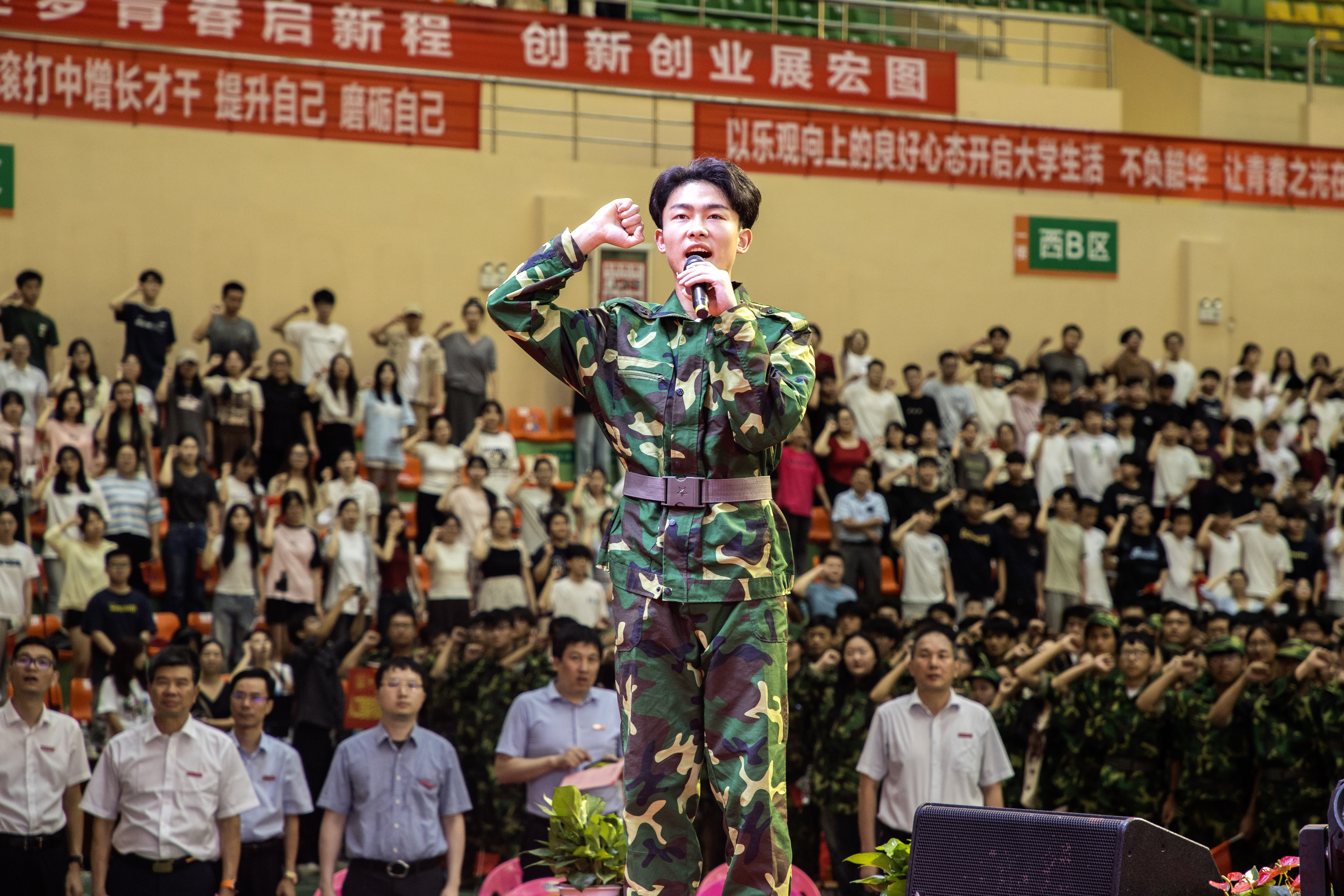 在新生代表的带领下,全体同学举起右手,目光坚定地注视着前方,声音响亮而整齐地宣读着誓词。