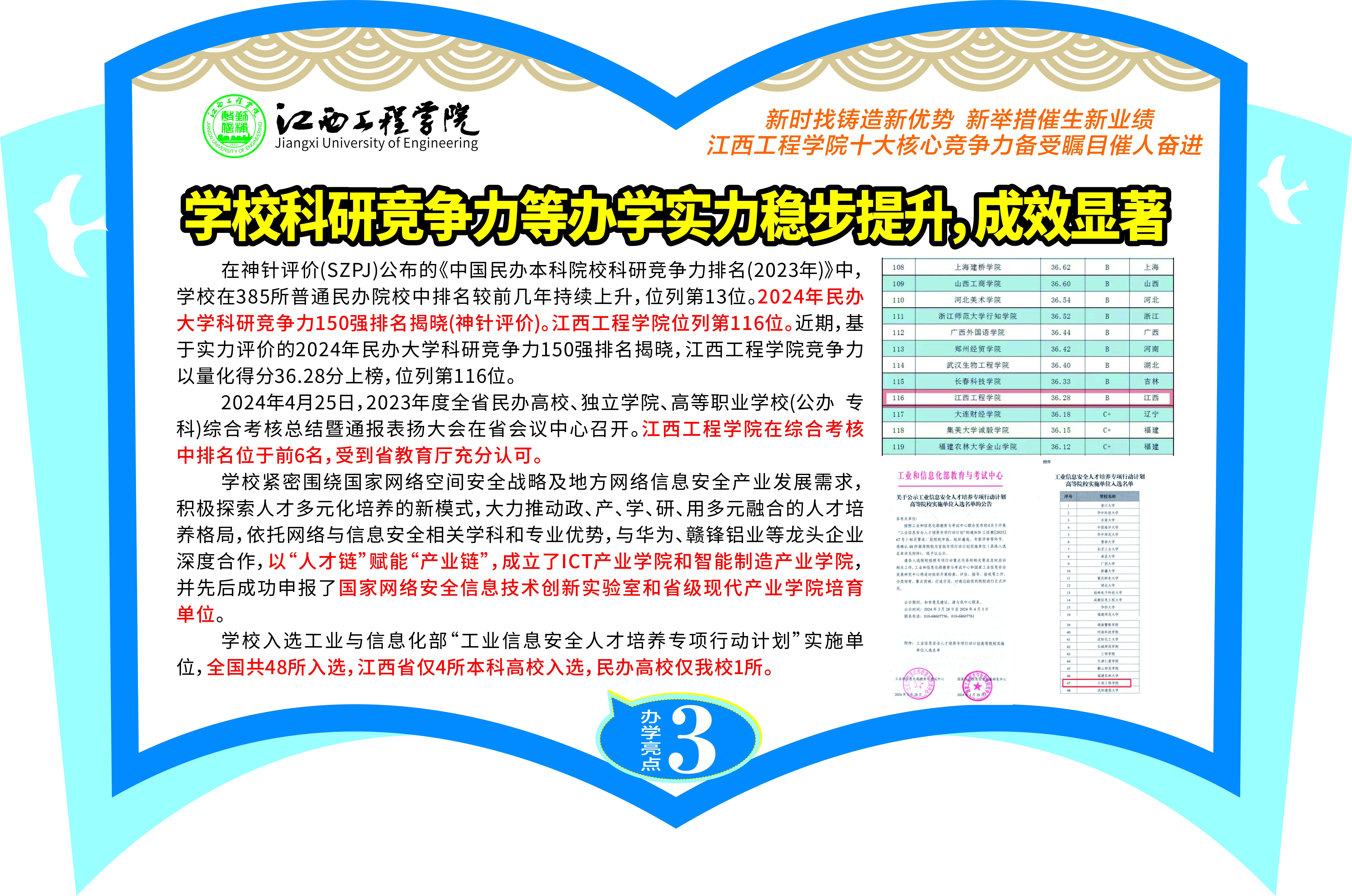 学校积极探索民办高等教育的办学规律和育人规律,大力创新人才培养模式,形成了天工文化育人特色,为中国民办高等教育发展提供了借鉴,形成了应用型教育领域著名的“新余现象,江工效应”。学校大力推动应用科技创新,多次参加中国科技第一展——深圳高交会,自主开发的科研产品获得2项优秀产品奖,创造了一枝独秀、独占鳌头的江西高校参展新纪录。连续四届参加江西省高校成果对接会,2023 年学校22个高科技项目参展,学校与企业共签约3个项目,签约金额达3600万元。华亿平台科研产品的实力展示和亮相,无论是中国科技第一展--中国国际高新技术成果交易会(简称高交会),还是在江西省首届高校科技成果对接会上,广受社会关注,大家纷纷留念打卡,赞不绝口。