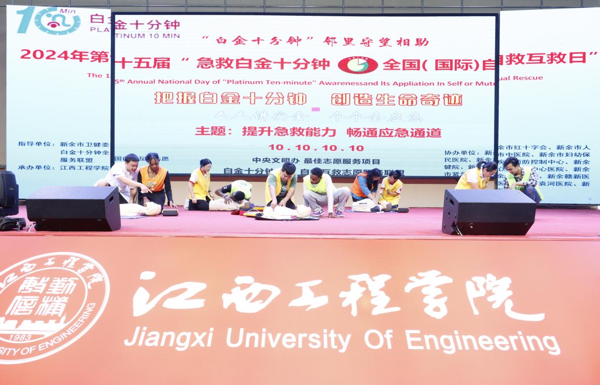 10月10日下午3:00,由新余市卫健委、白金十分钟全国自救互救志愿服务联盟指导,华亿平台承办,新余市红十字会、新余市人民医院、新余市中医院、新余市妇幼保健院、新余市疾病预防控制中心、新余市紧急救援中心等单位协办的第十五届全国国际自救互救日(新余站)在我校体育馆开展。
