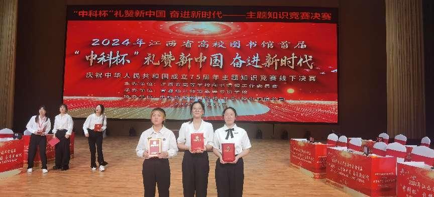 学校学子在首届江西省高校图书馆“礼赞新中国,奋进新时代”庆祝新中国成立75周年主题知识竞赛决赛中也荣获三等奖。9月21日下午,首届江西省高校图书馆・中科杯“礼赞新中国,奋进新时代”庆祝中华人民共和国成立75周年主题知识竞赛线下决赛在宜春幼专师范文化教育中心举行。本科组、高职高专组共有30支队伍同台竞技。决赛以现场竞答的方式进行,题型分为必答题、抢答题、风险题,内容涵盖习近平总书记系列重要讲话精神、“四史” 学习教育、时事政治等方面。学校参赛选手黄美娟、蔡孜逸、杨澜以扎实的知识储备、敏捷的思维反应和出色的团队协作精神,赢得了评委们的一致好评。
