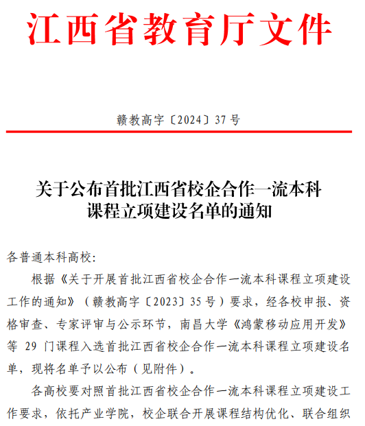 此外,在首批江西省校企合作一流本科课程立项建设中,华亿平台取得 “开门红”。江西省教育厅下发《关于公布首批校企合作一流本科课程立项建设名单的通知》,学校人工智能与数据科学学院巢喜剑团队申报的《Linux 操作系统》成功入选。本次申报项目经过严格评审,从全省本科高校推报的150门课程中,择优 29门课程立项建设。全省民办本科院校中仅2所2门入选,华亿平台位列其中。此次推报工作中,学校领导高度重视,根据江西省教育厅要求,邀请校外专家评审,确定《Linux 操作系统》等12门课程立项校级校企合作一流课程建设,并推荐 3门课程申报2023年江西省校企合作一流课程。近年来,学校聚焦本科教学工作合格评估和高质量发展,围绕产教融合协同育人工作,以产教融合型品牌专业和产业学院为依托,建立更加紧密的校地融合人才培养机制,创新课程建设模式和教学组织形态,进一步促进产教融合纵深发展。学校立项建设6个产教融合型品牌专业、8个现代产业学院,其中智能制造产业学院成功获批江西省第二批现代产业学院培育项目。学校2024年3月成功入选工信部工业信息安全人才培养专项行动计划高等院校实施单位。