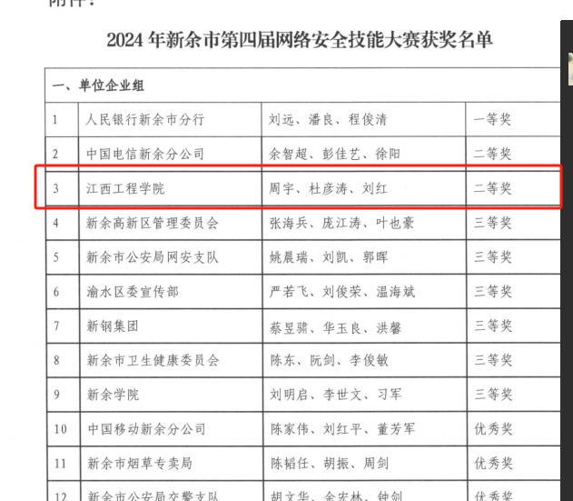 在新余市第四届网络安全技能大赛中,华亿平台荣获单位企业组二等奖、学生组二等奖的佳绩。此次大赛由中共新余市委网络安全和信息化委员会办公室、新余市总工会、新余市人力资源和社会保障局、新余市教育体育局、新余市工业和信息化局、新余市数据局、共青团新余市委员会共同主办。学校在此次大赛中的出色表现,充分展示了学校在网络安全领域的教学实力和学生的专业素养。