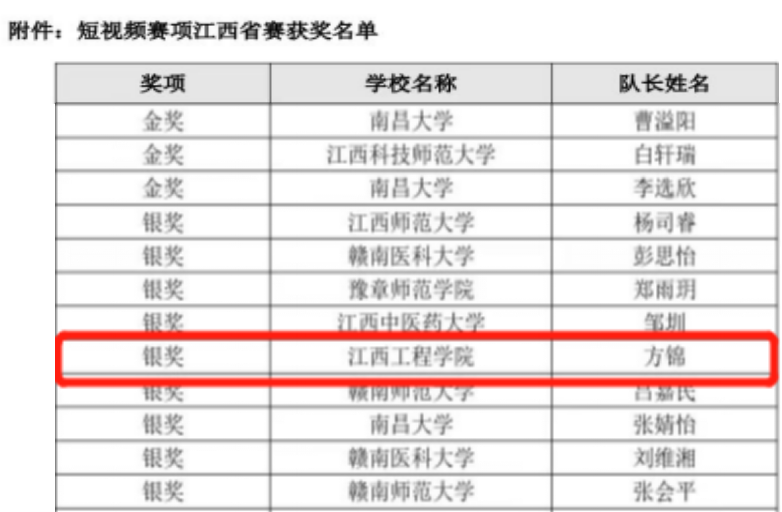 我校参赛团队(方锦、周毅、丁声峰、谢婧)在语言与传播学院教师杨丽姜的指导下,与南昌大学、江西师范大学等省内一流院校同台竞技。经过紧张激烈的角逐,短视频《智能织梦, 非遗绣球》荣获江西省银奖。
