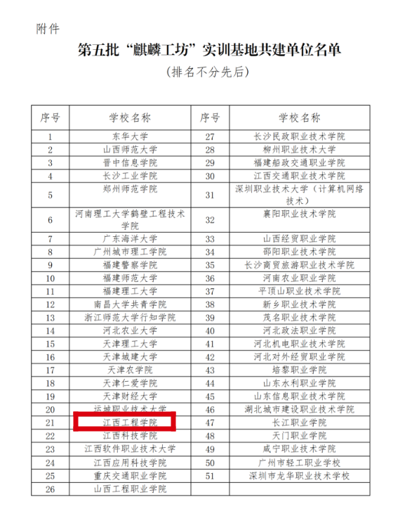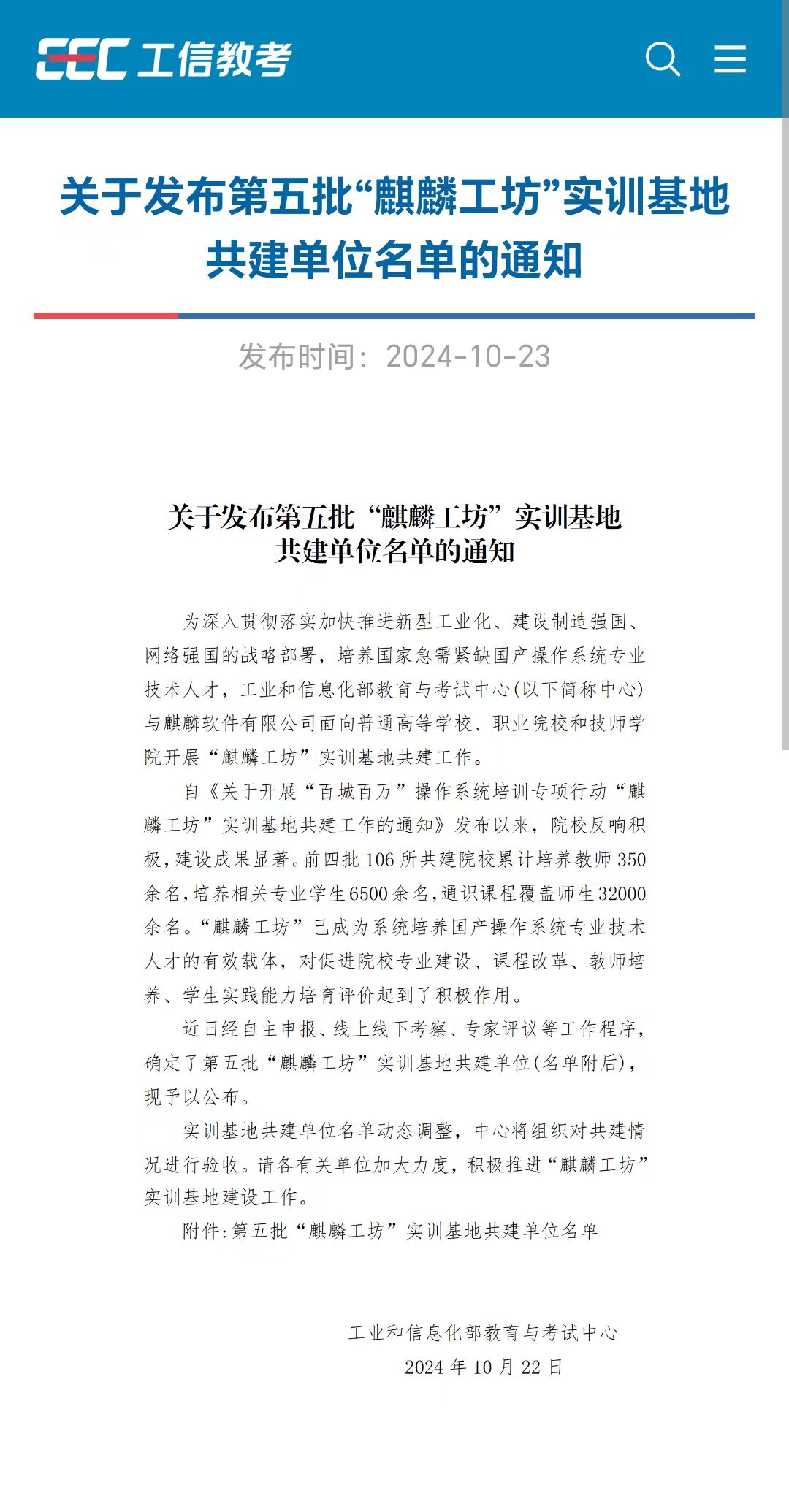 2024年10月23日,工业和信息化部教育与考试中心公布第五批“麒麟工坊”实训基地共建单位名单,江西工程学院成功获批。这是继该校获批工信部“工业信息安全人才培养专项行动计划实施单位”后取得的又一重大成果,为学校产教融合、创新育人工作注入了新的活力,也标志着学校向应用型高校建设的道路上又迈出了坚实的一步。