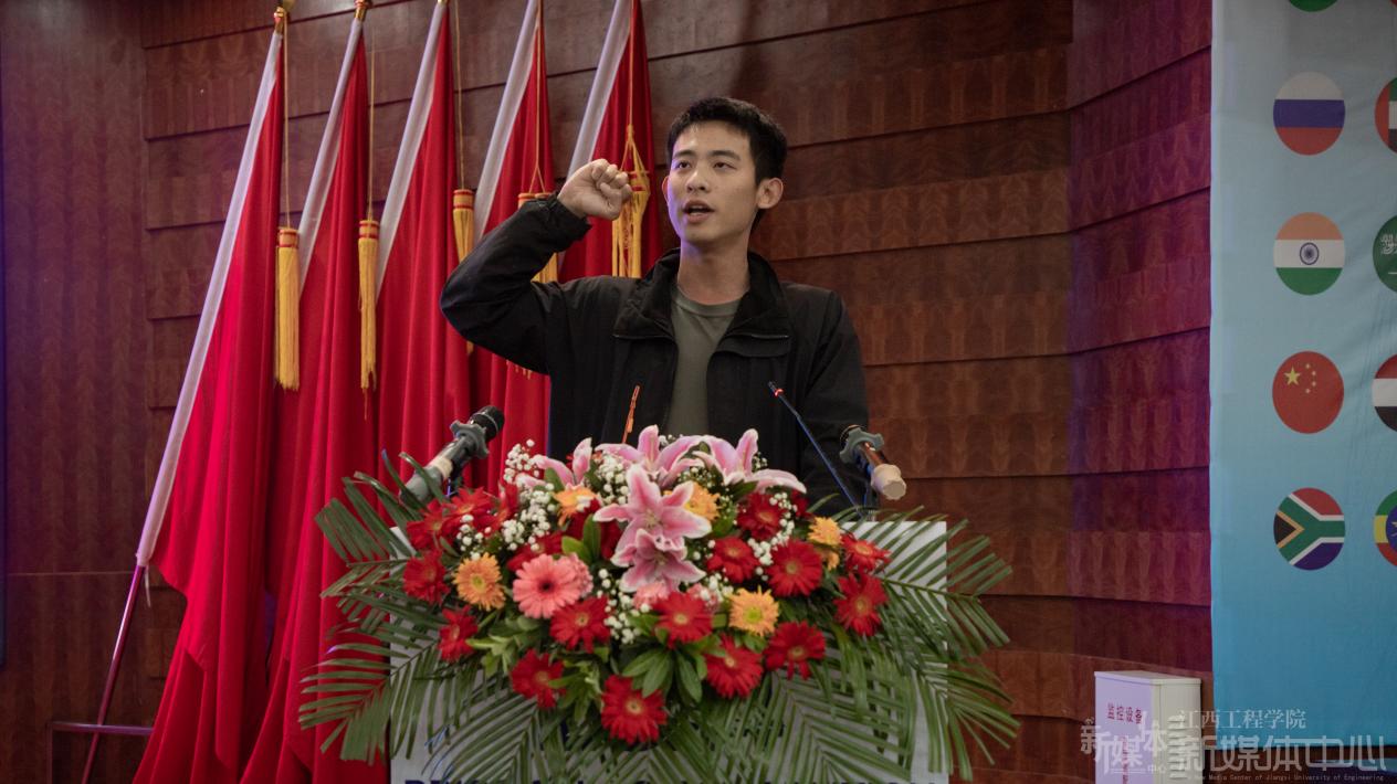 参赛选手林诗盛代表全体参赛队员庄严宣誓,坚决服从大赛安排,服从裁判,尊重对手,文明参赛,严格遵守大赛纪律和大赛规则,以良好的精神面貌展示技能,赛出成绩、赛出风格、赛出水平,为金砖国家职业技能大赛增光添彩。