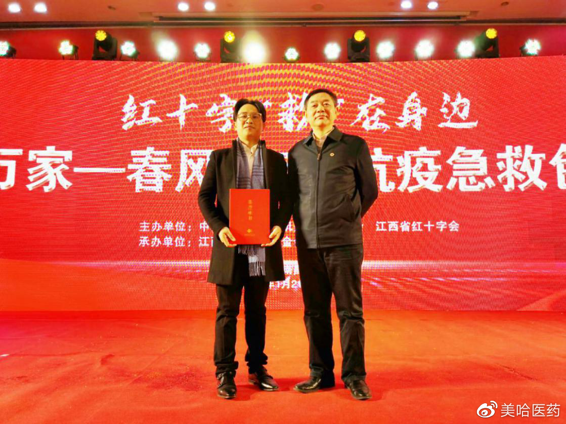 上海美哈医药科技集团有限公司在此次仪式上,向江西省红十字会、江西省红十字基金会捐赠50万份抗疫急救包,用于助力江西省内新冠肺炎疫情常态化防控工作。由此,江西省红十字会党组书记、常务副会长龚建辉特授予上海美哈医药科技集团有限公司荣誉证书,以资鼓励!