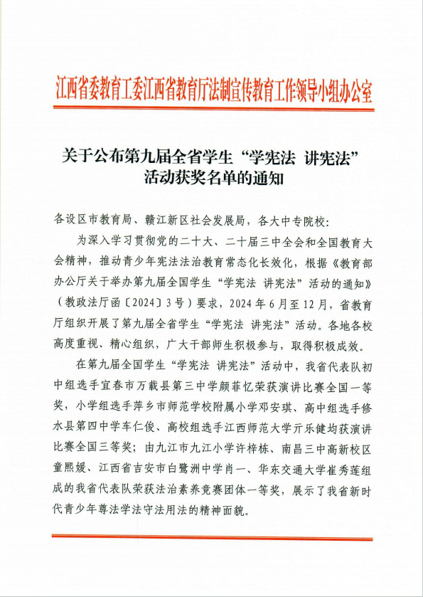 法治兴则国兴,法治强则国强。法治是国家治理体系和治理能力的重要依托。近日,由江西省教育厅主办的第九届全省学生“学宪法 讲宪法”省赛决赛圆满落幕。我校经济管理学院2021级电子商务本科2班王琳同学荣获高校组演讲比赛三等奖,教育与健康管理学院2023级小学教育本科2班沈艳同学荣获法治素养竞赛三等奖。