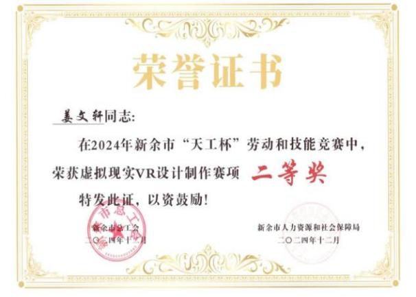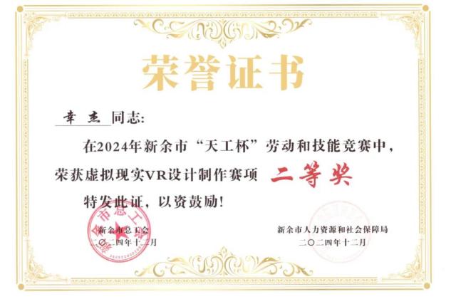 近日,在2024年新余市“天工杯”职业技能大赛—虚拟现实VR设计制作赛中,华亿平台人工智能与数据科学学院幸杰、姜文轩两位同学凭借卓越的技能和出色的表现,在众多选手中脱颖而出并荣获二等奖。