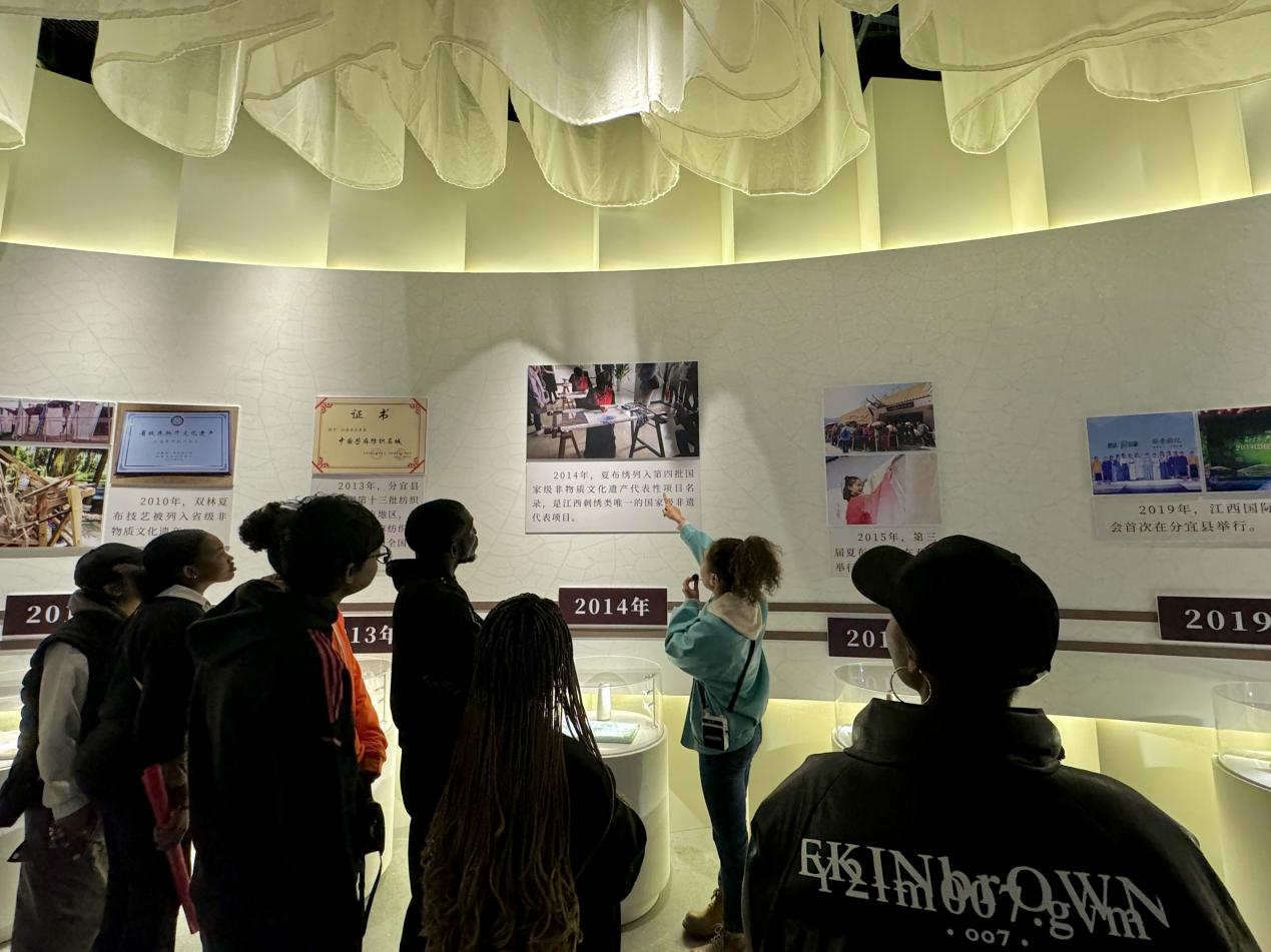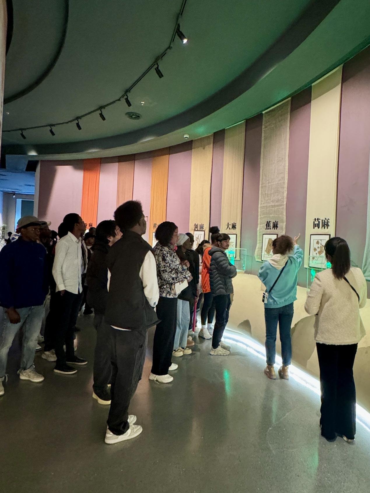 来到分宜县,在讲解员和翻译老师的带领下,留学生们沿着“探麻、识麻、懂麻、用麻”的叙事线索,逐一参观了博物馆的六大篇章:“巧工天物”、“万年衣祖”、“天工古法”、“麻艺传承”、“麻园漫步”和“麻望未来”。每个篇章都通过丰富的展品、生动的多媒体展示和互动体验设备,向参观者展示了麻文化的深厚底蕴和独特魅力。