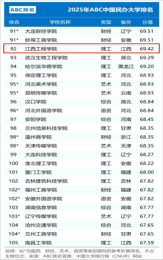 2025年ABC中国大学排名,共有1210所本科院校登上榜单,覆盖公办、民办、独立学院以及中外合作办学高校等多种类型,在此次排名中,学校表现亮眼,位居全国民办院校第92名,在江西省内更是排名第4名,充分彰显了学校在高等教育领域的强劲实力和巨大潜力。